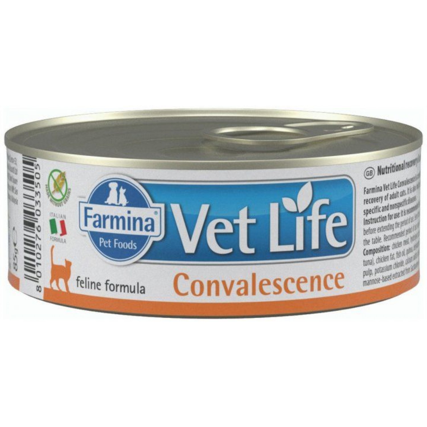 Farmina VetLife Convalescence - повнораційний дієтичний беззерновий вологий корм для дорослих кішок ідеально підходить тваринам у період відновлення після перенесених захворювань та після хірургічних операцій. Корм особливо корисний для лікування шлунково-кишкового тракту після хірургічних втручань. Висока енергетична цінність та засвоюваність вологого корму дозволяють відновити ідеальну масу тіла тварини та зміцнити її сили.