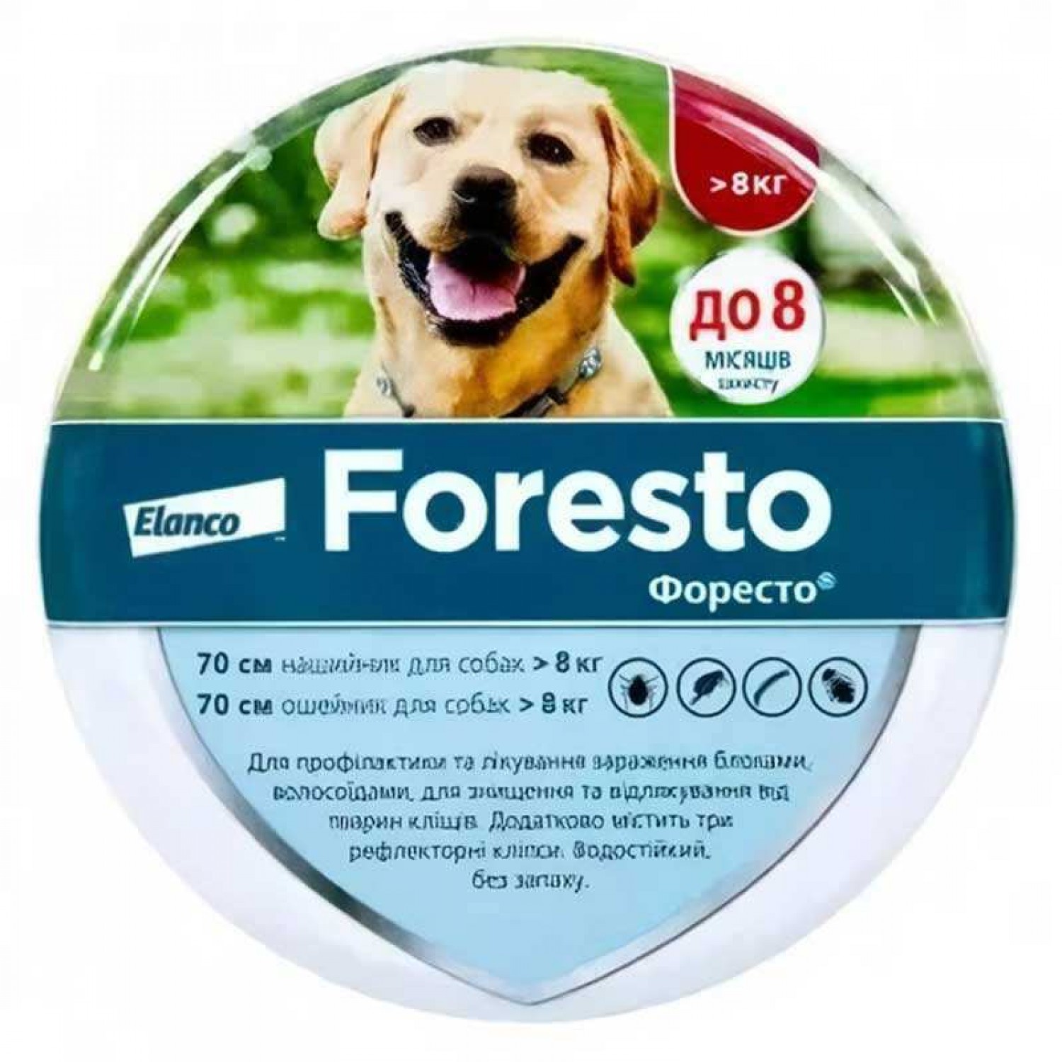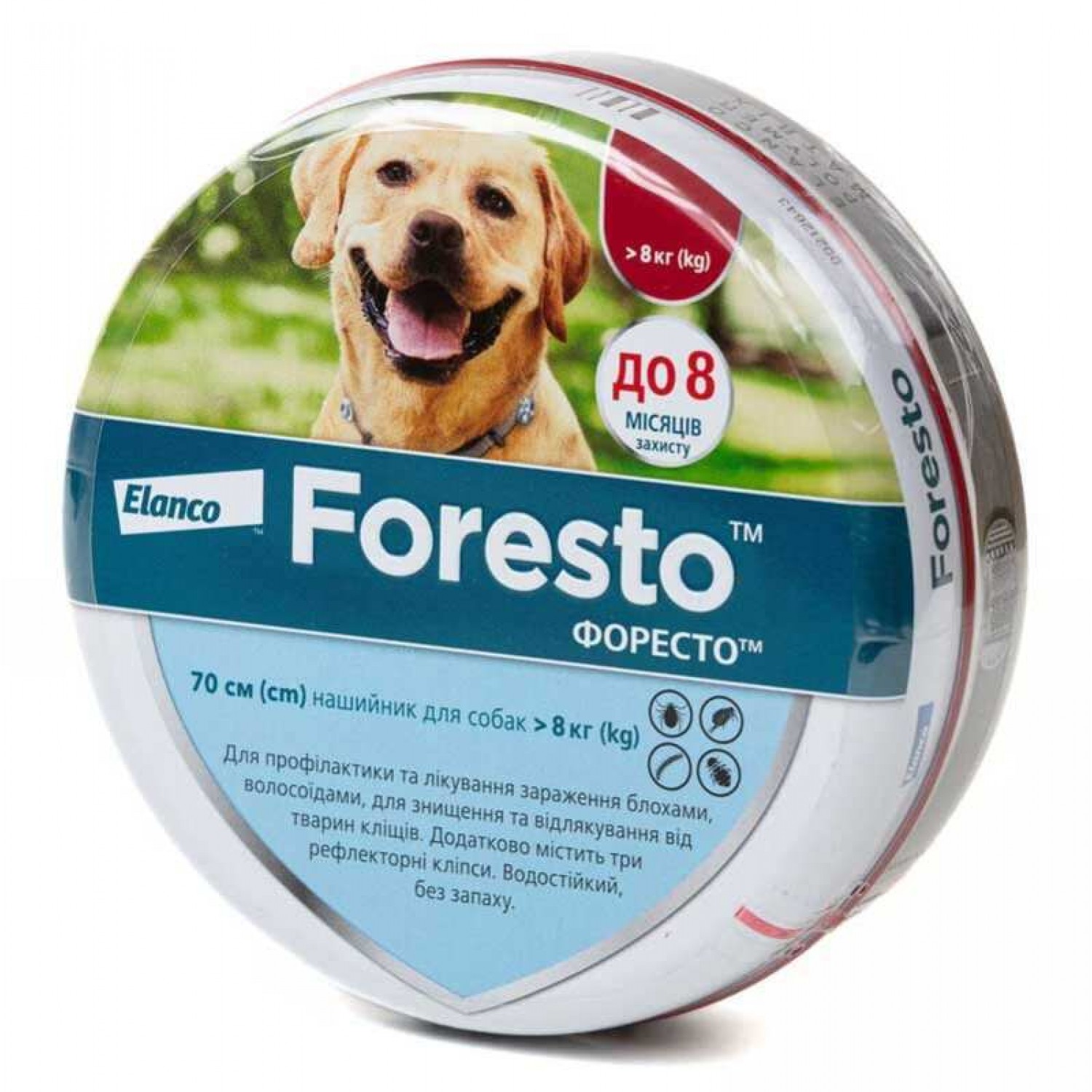 Bayer Foresto - використання нашийника забезпечує захист собак від бліх, вошей, волосоїдів протягом 6 місяців, а від іксодових кліщів протягом 7-8 місяців. Також містить три світловідбиваючі затискачі, які можуть бути прикріплені до нашийника для того, щоб тварина була помітна в темряві. Довжина нашийника 70 см - для великих порід собак.