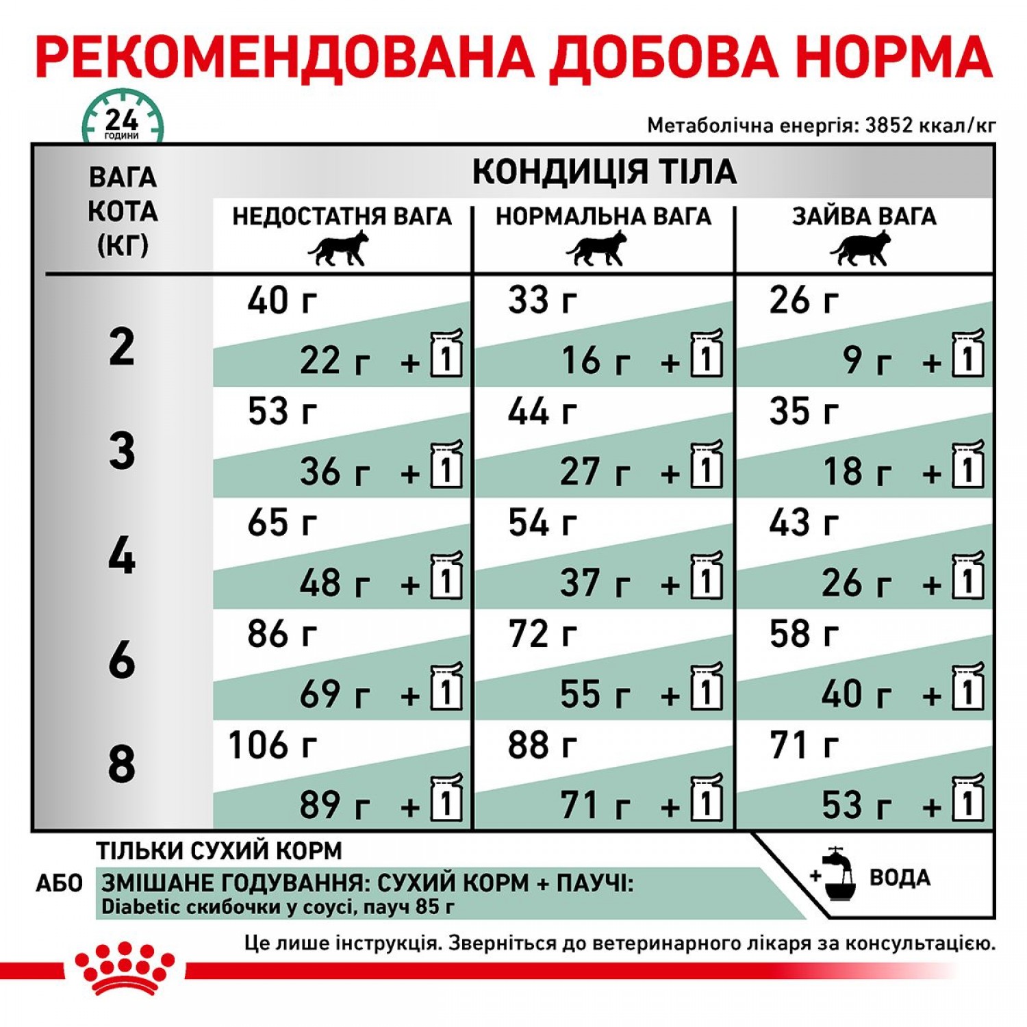 Діабетичний сухий корм для дорослих котів віком від 12 місяців із захворюванням на цукровий діабет. Сприяє регуляції рівня глюкози в крові після вживання корму. Містить високий рівень білка для підтримки оптимальної м'язової маси. Характеризується зниженим рівнем крохмалю у своєму складі. Підтримує сечовидільну систему.