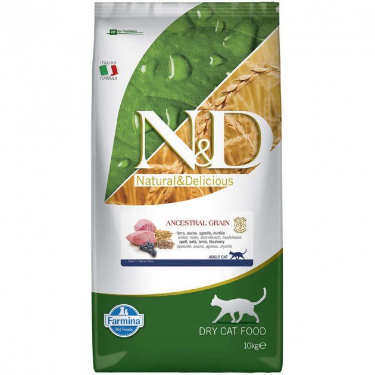 Farmina N&D низькозерновий сухий корм для дорослих котів з ягням та чорницею.