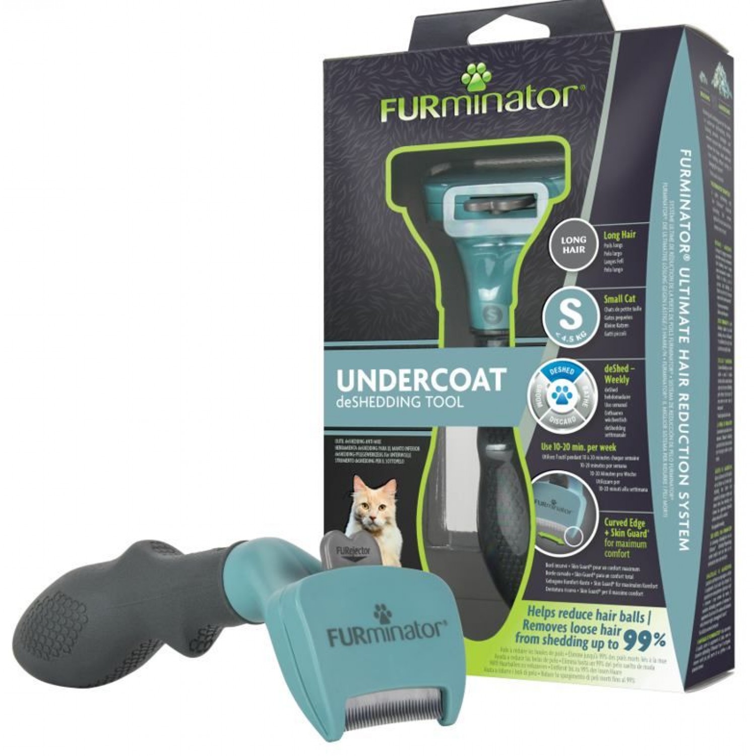 Інструмент FURminator S для котів до 4,5 кг з довгою шерстю зменшує линяння на 90%. Призначений для шерсті довжиною до 5 см. Використовуйте на суху шерсть1-2 рази на тиждень протягом 10-20 хвилин.