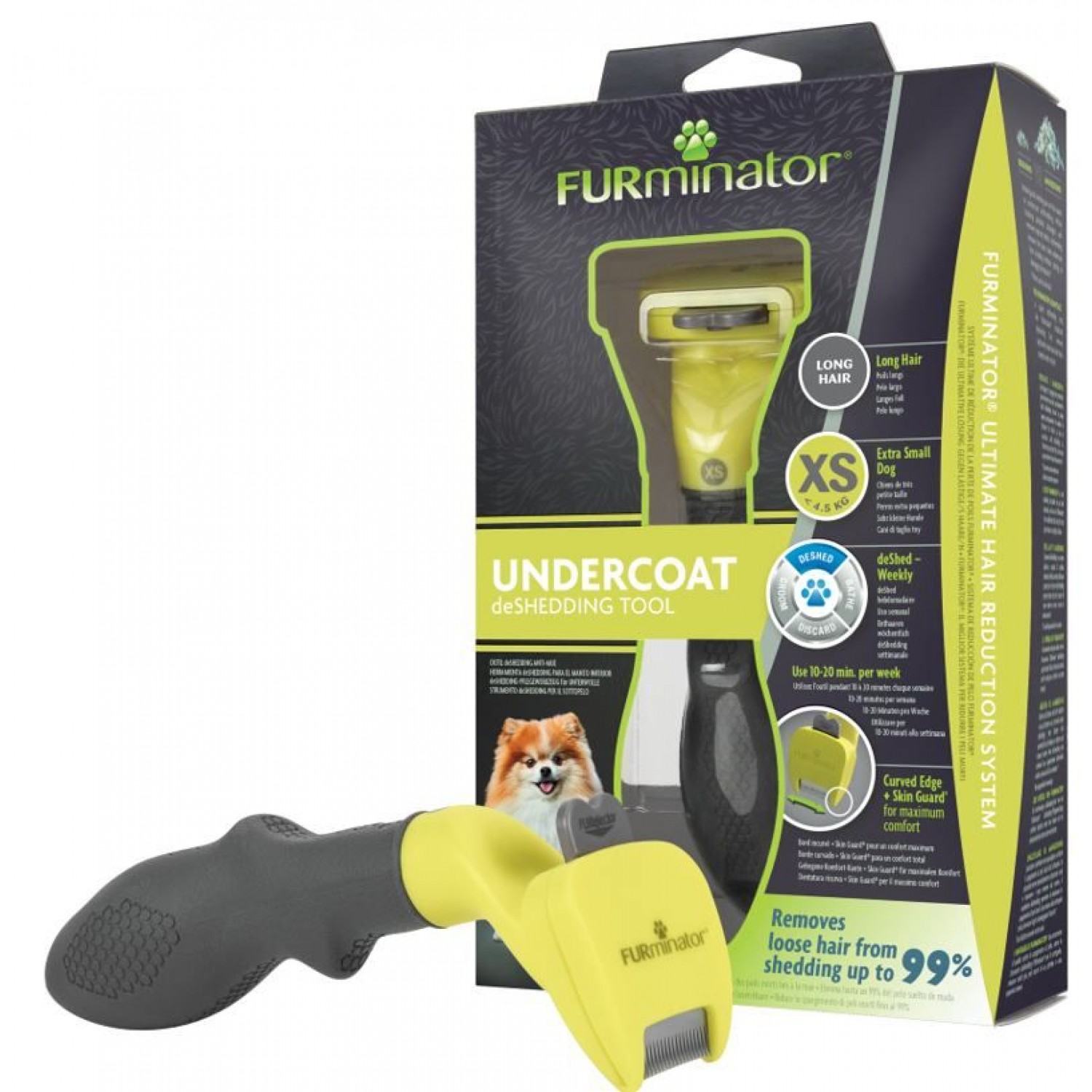 Інструмент FURminator XS для мініатюрних собак (до 4,5 кг) із довгою шерстю зменшує линяння на 90%. Призначений для шерсті довше 5 см. FURminator для собак з довгою шерстю ефективно видаляє вісцеву шерсть, що випала і зайве підшерстя всього за 10-15 хвилин на тиждень. Це покладе край шерсті на одязі, диванах та в машині. Інструмент також покращить самопочуття вашого собаки і запобігатиме свербінню та сухості шкіри. FURminator швидко і легко подбає про вашого собаку. Використовуйте на сухій шерсті 1-2 рази на тиждень протягом 10-20 хвилин.