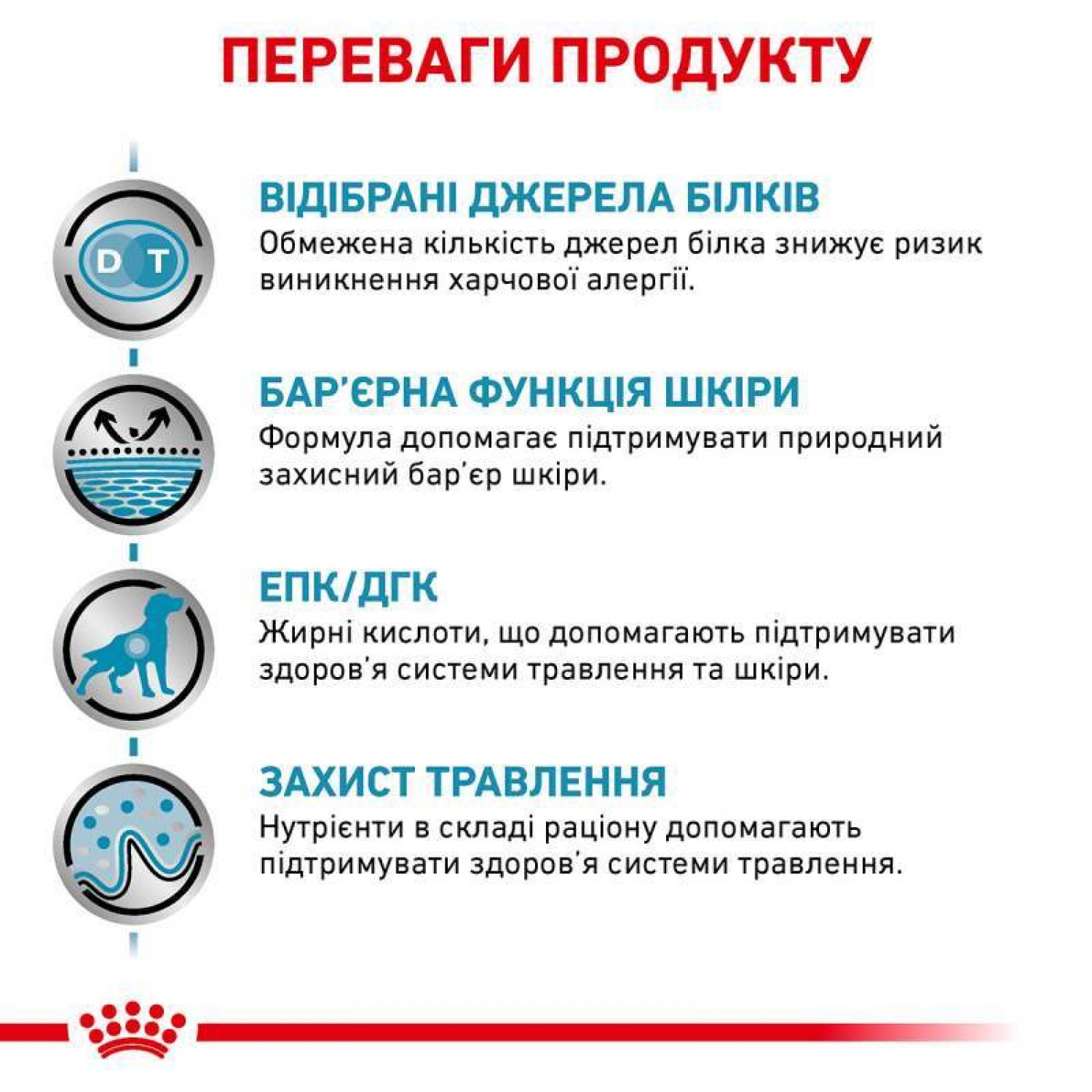 Сухий дієтичний корм для дорослих собак при проявах харчової несумісності. Спеціально розроблений як добавка до основного раціону харчування, щоб зняти негативні реакції на основний корм собаки - алергічні прояви, розлад травлення. Допомагає мінімізувати їх без зміни основного раціону. Може супроводжувати його до кінця життя. Рекомендується особливо до застосування при хворобах кишково-шлункового тракту. Позитивно впливає на його роботу. Забезпечує захист шкіри та шерсті.