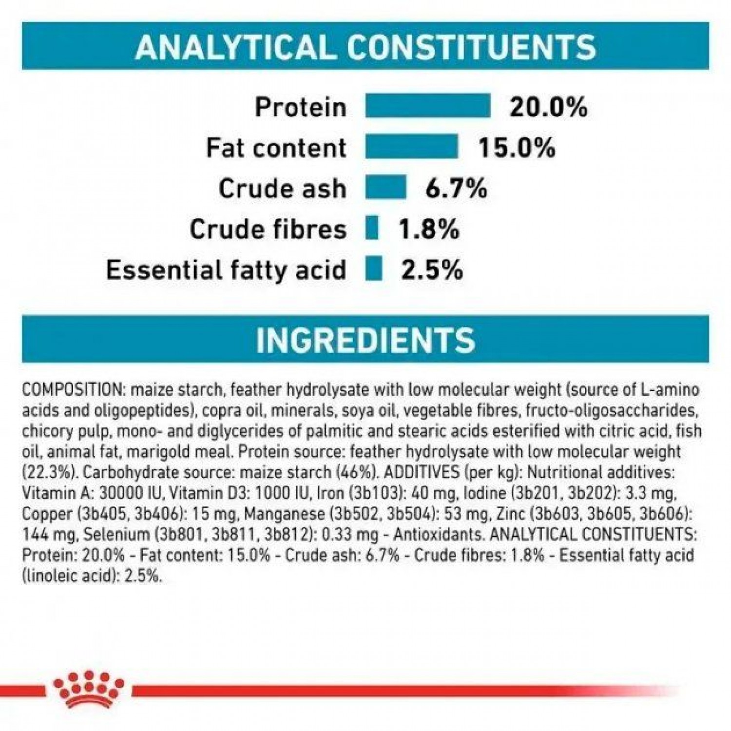 Склад: кукурудзяний крохмаль, пір’євий гідролізат малої молекулярної ваги (джерело L-амінокислот та олігопептидів), кокосова олія, мінеральні речовини, соєва олія, рослинна клітковина, фруктоолiгосахариди, жом цикорію, моно- та дигліцериди пальмітинової та стеаринової кислот, етерифіковані лимонною кислотою, риб’ячий жир, тваринний жир, борошно чорнобривців прямостоячих, антиоксиданти.