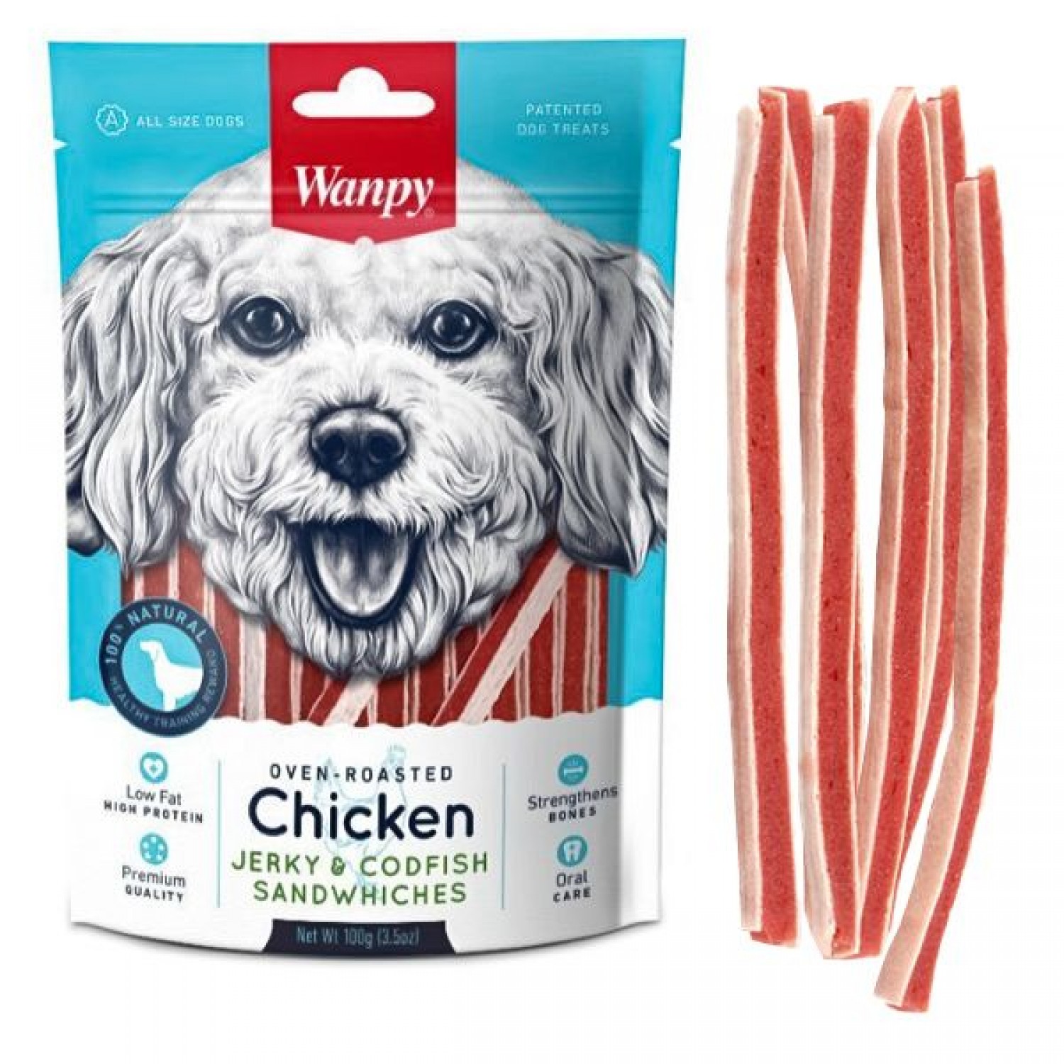 Сендвіч-смужки Wanpy Chicken Jerky & Codfish Sandwiches – натуральні ласощі для собак на основі в’яленого м’яса курки та філе тріски. Призначені як смачне та корисне доповнення до основного раціону собак та цуценят всіх порід від 3-х місяців.