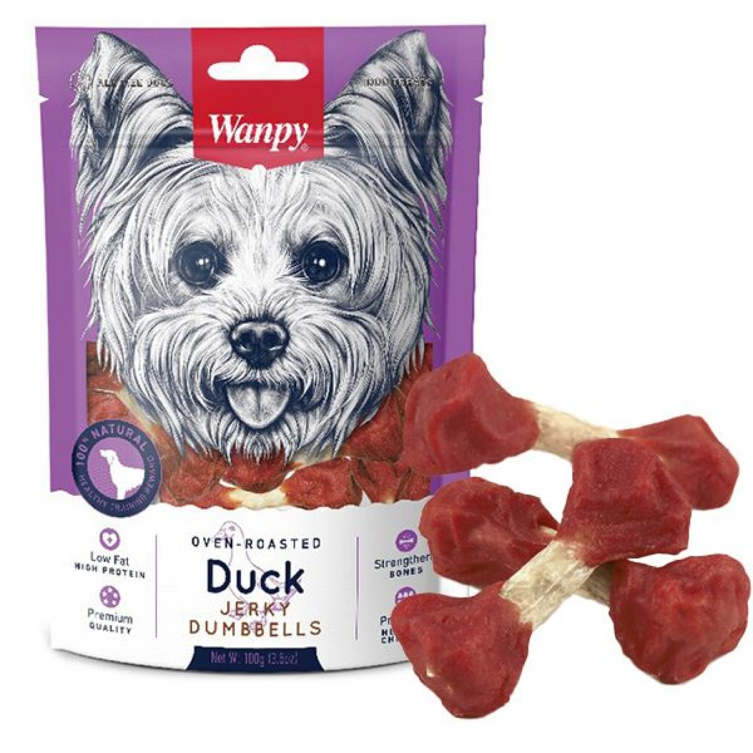 Кістка-гантель Wanpy Duck Jerky Dumbbells – натуральні ласощі для собак на основі в’яленого м’яса качки із сиром’ятною шкірою. Призначені як смачне і корисне доповнення до основного раціону собак і цуценят всіх порід від 3-х місяців.