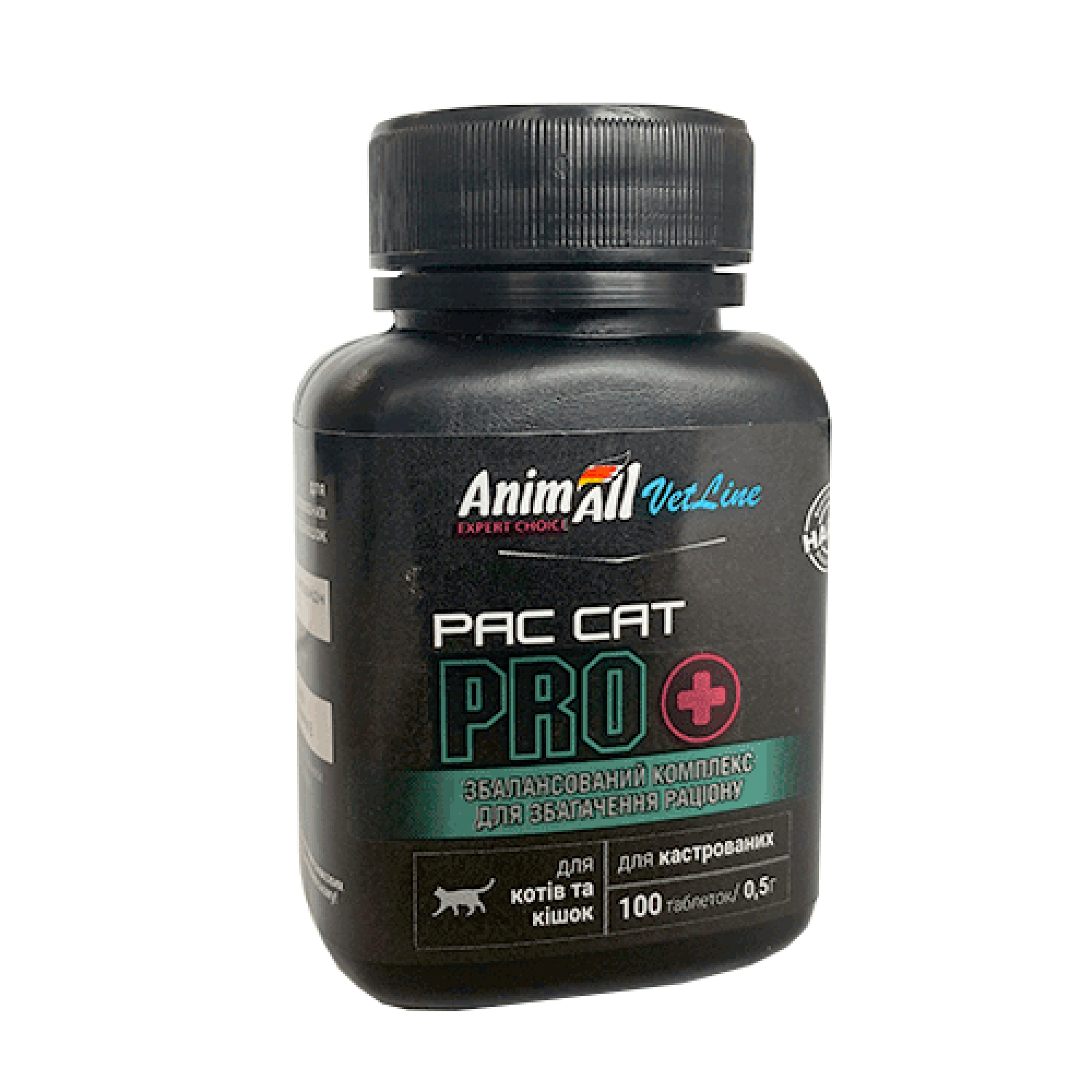 AnimAll VetLine Pac Cat PRO - збалансований комплекс для збагачення раціону кастрованих котів і кішок, призначений для доповнення добової потреби у вітамінах і збалансування окисно-відновних процесів в організмі.