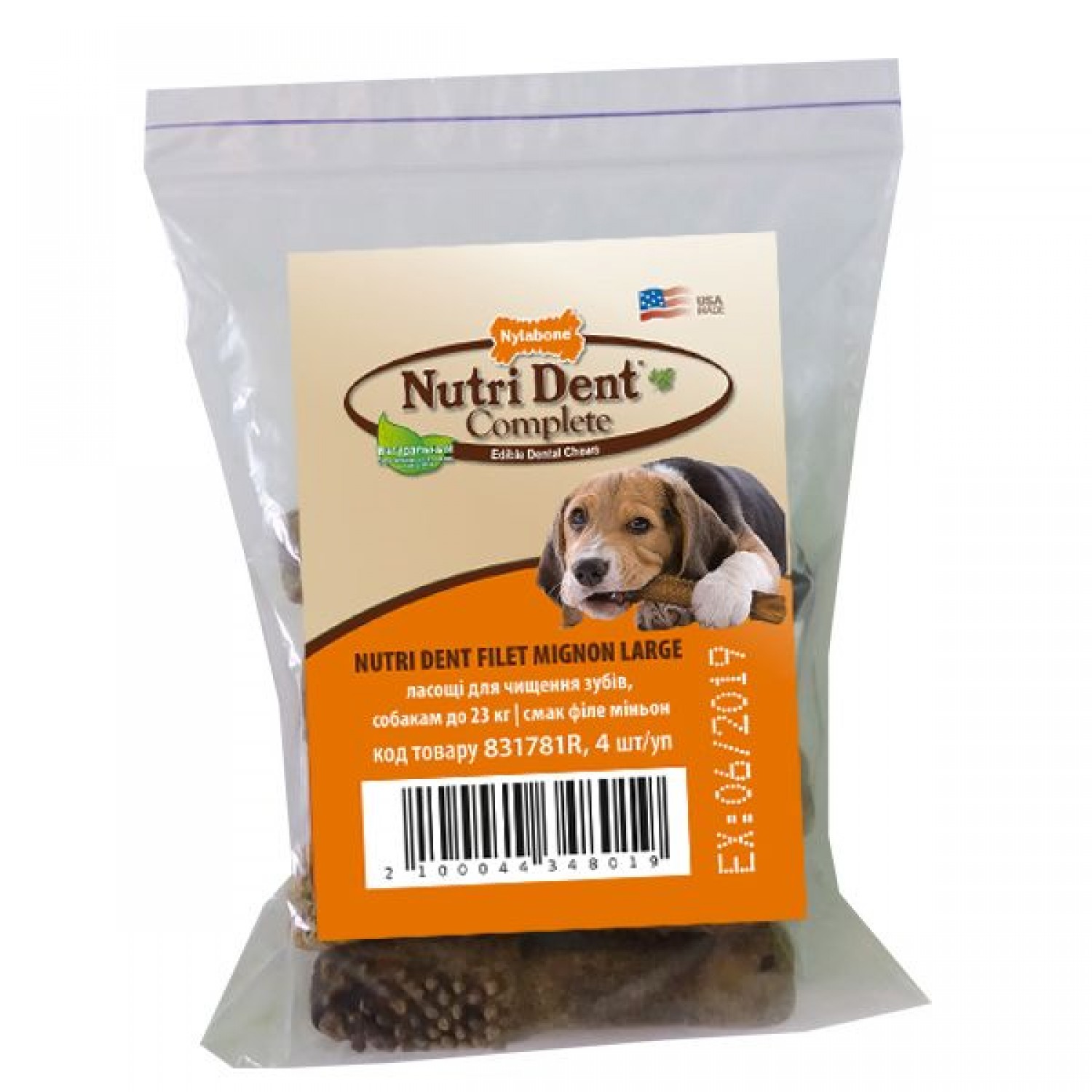 Nylabone Nutri Dent Filet Mignon Large - корисні і смачні жувальні ласощі зі смаком філе міньйон для собак великих порід вагою 16-23 кг. Ласощі не тільки приємні на смак, але і завдяки особливій формі та структурі, відмінно очищують зуби тварини, запобігаючи появі зубного нальоту і зубного каменю. Клінічно доведено - діє краще зубної щітки.