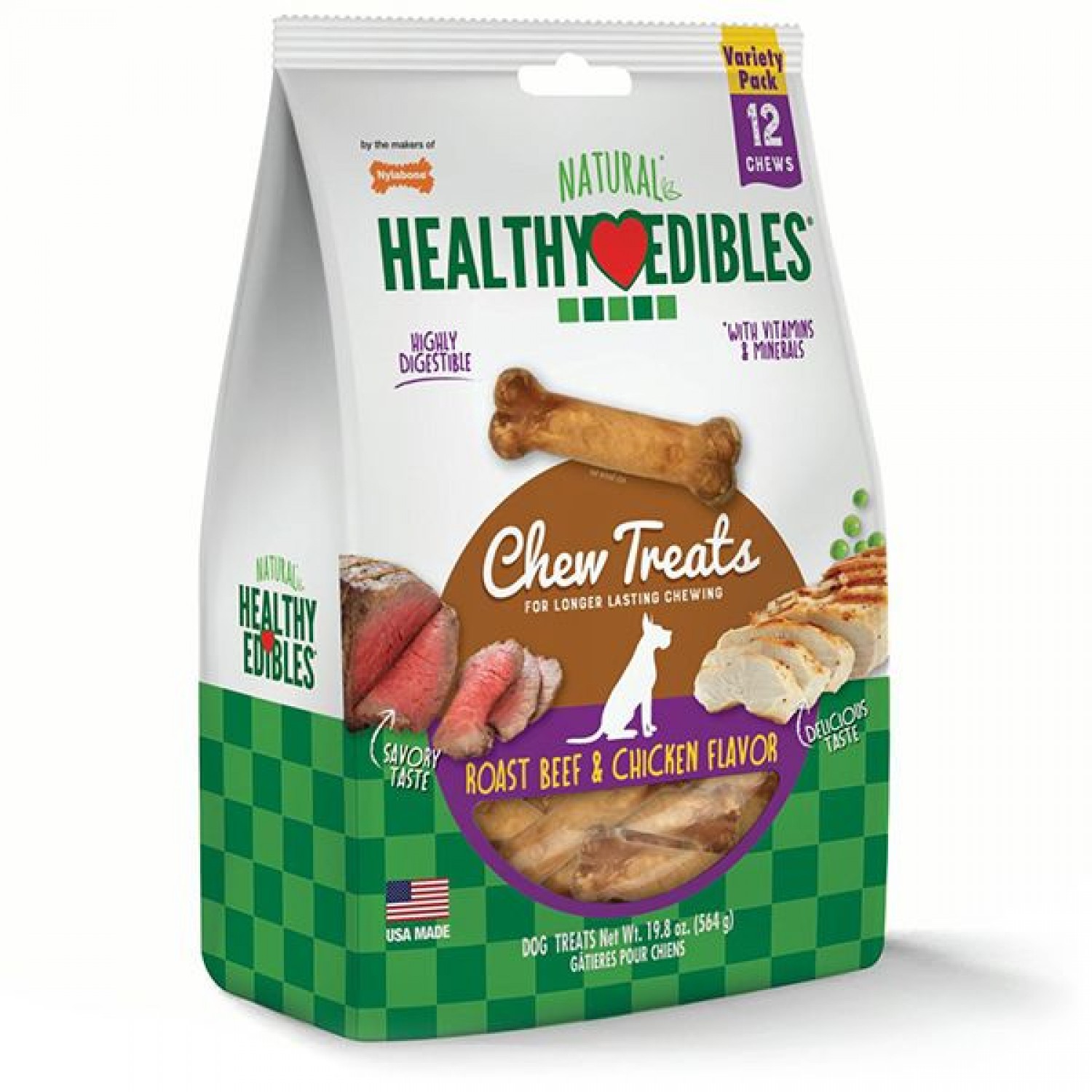 Жувальні ласощі для собак Nylabone Healthy Edibles Roast Beef & Chicken приготовані за смачним рецептом з використанням натуральних інгредієнтів, включаючи м'ясо (яловичину та курку) та овочі. Виробник врахував смак собак, тому додав у закуску пікантний аромат бекону для ще більшої привабливості.