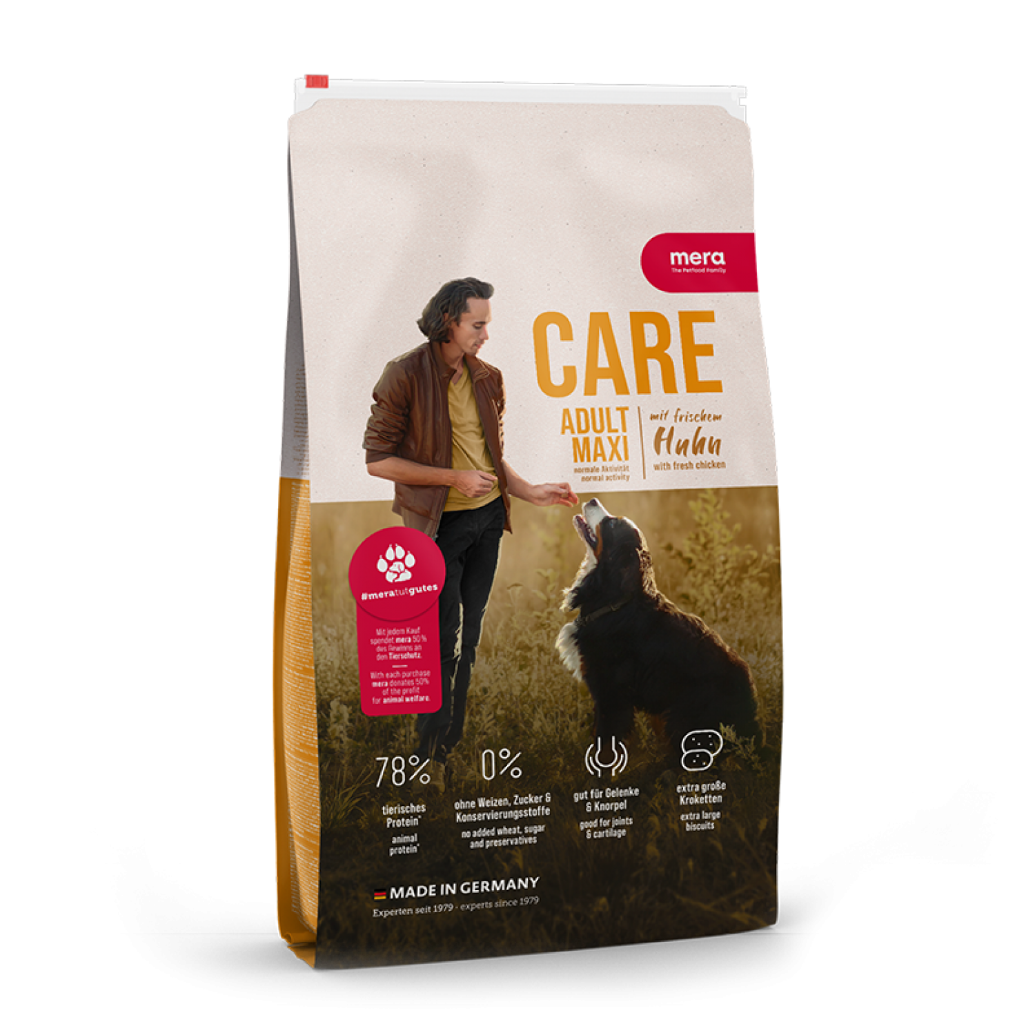 MERA Care Adult Maxi Chicken - сухий корм для дорослих собак великих порід з нормальним рівнем активності з куркою. Лінія продуктів MERA CARE це високоякісні корми для домашніх тварин, які спеціально адатовані до потреб вихованця. Велика кількість свіжого м'яса робить корм особливо смачним для собаки, а ретельно розроблена формула кожного рецепта задовольняє потреби більшості вихованців. Нове і найкраще для кожного улюбленця!
