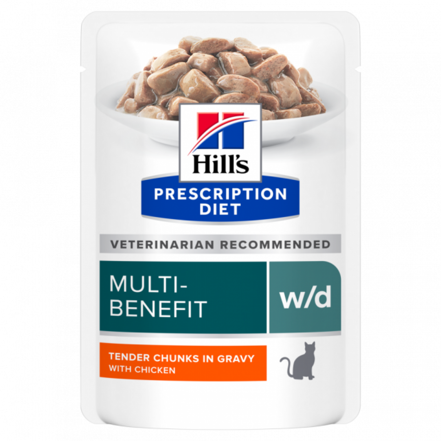 Вологий корм для котів Hill’s PD w/d, з куркою – повнораціонне дієтичне харчування, спеціально розроблене дієтологами та ветеринарними лікарями для стабілізації рівня глюкози у крові, підтримання роботи ШКТ завдяки додаванню до раціону клітковини, підтримання оптимальної ваги та підтримки здоров’я сечовидільної системи.