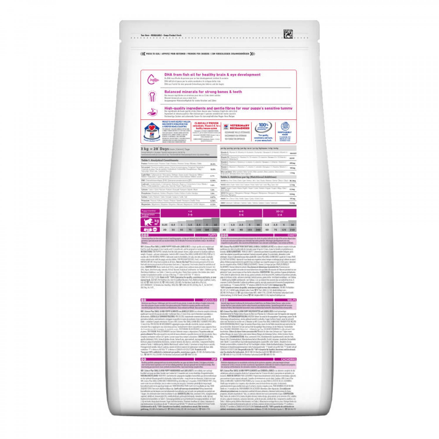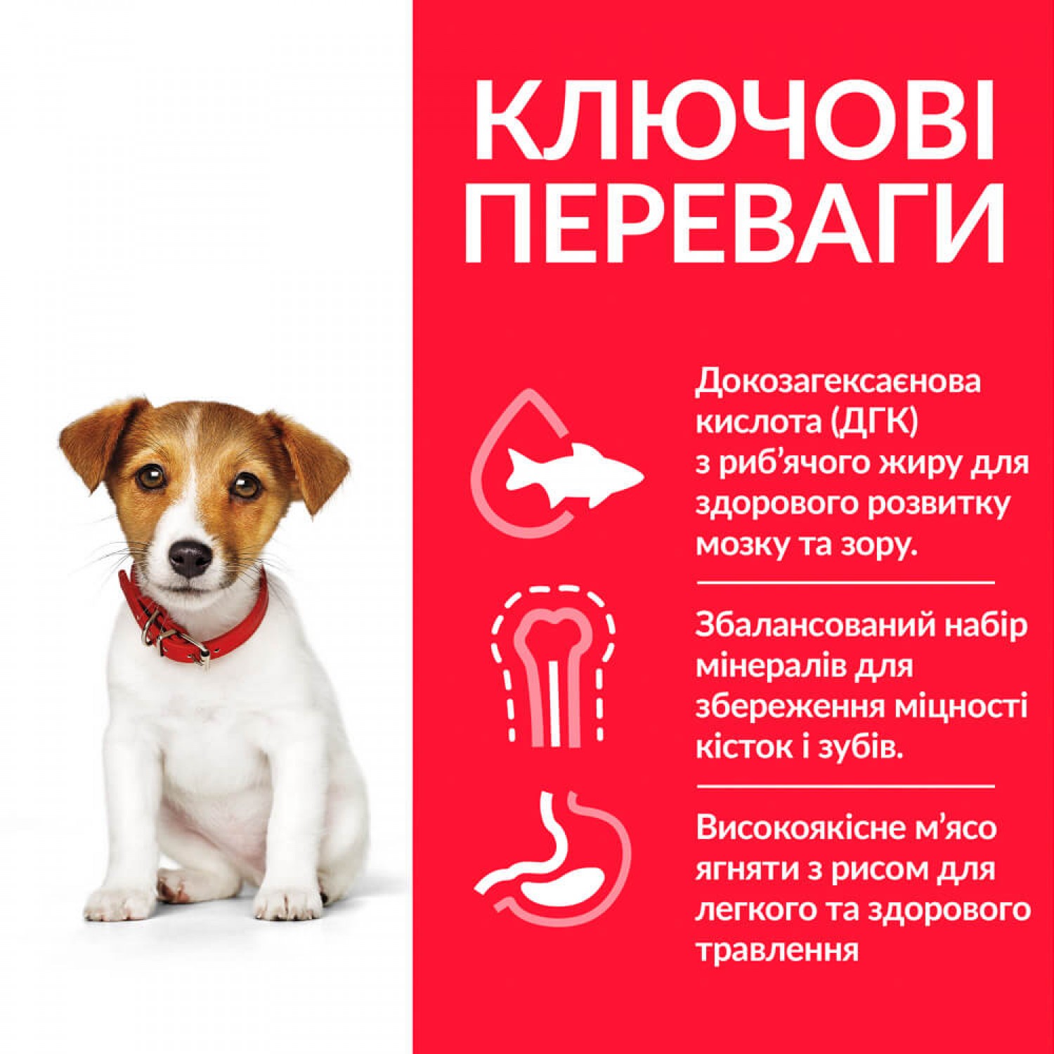 Сухий корм для собак Hill’s Science Plan Puppy Small & Mini з ягням і рисом - повнораціонне харчування, спеціально розроблене для задоволення потреб росту собак малих і мініатюрних порід віком до 1 року. Це корм суперпреміум класу для домашніх улюбленців вагою до 10 кг у дорослому віці. Він має форму маленьких гранул, розроблених для вашого цуценяти малої породи.