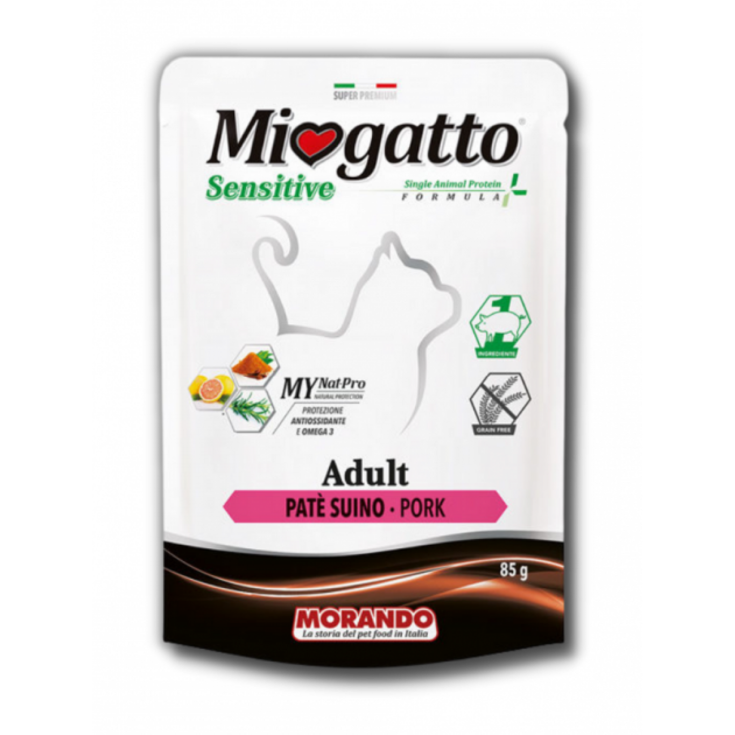 Miogatto Sensitive не містить ніяких штучних консервантів, ароматизаторів і барвників, має натуральний і дуже привабливий смак і консистенцію.