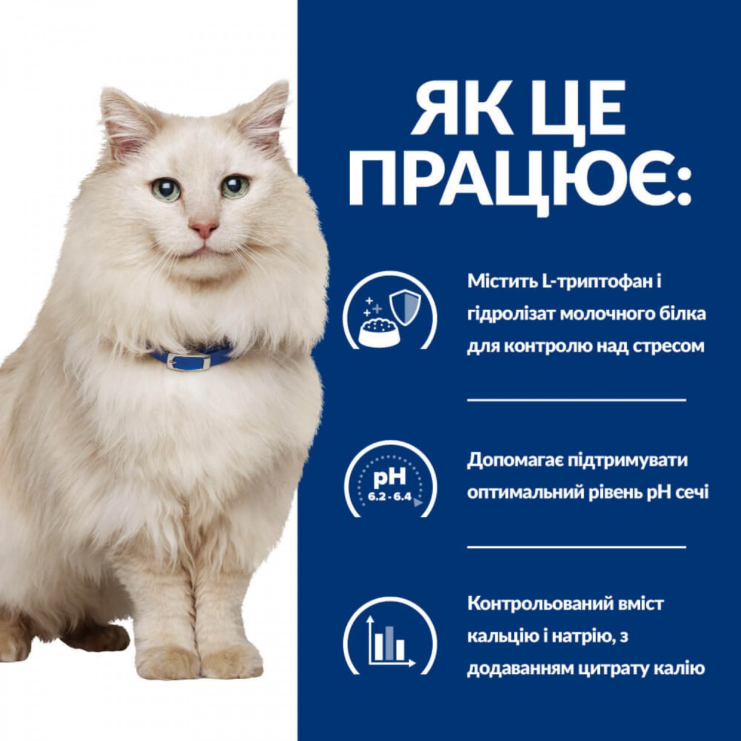 - Містить L-триптофан і гідролізат молочного білка, що допомагають подолати стрес, який є значним фактором ризику виникнення ідіопатичного циститу котів.