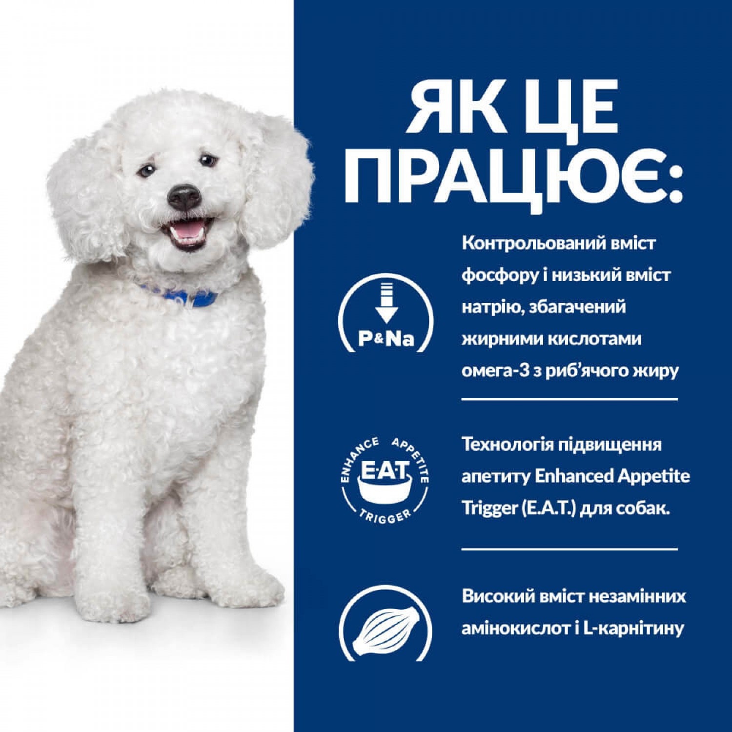 - Технологія підвищення апетиту Enhanced Appetite Trigger (E.A.T.) стимулює апетит у собак із захворюваннями нирок, які потребують підвищеного споживання калорій.