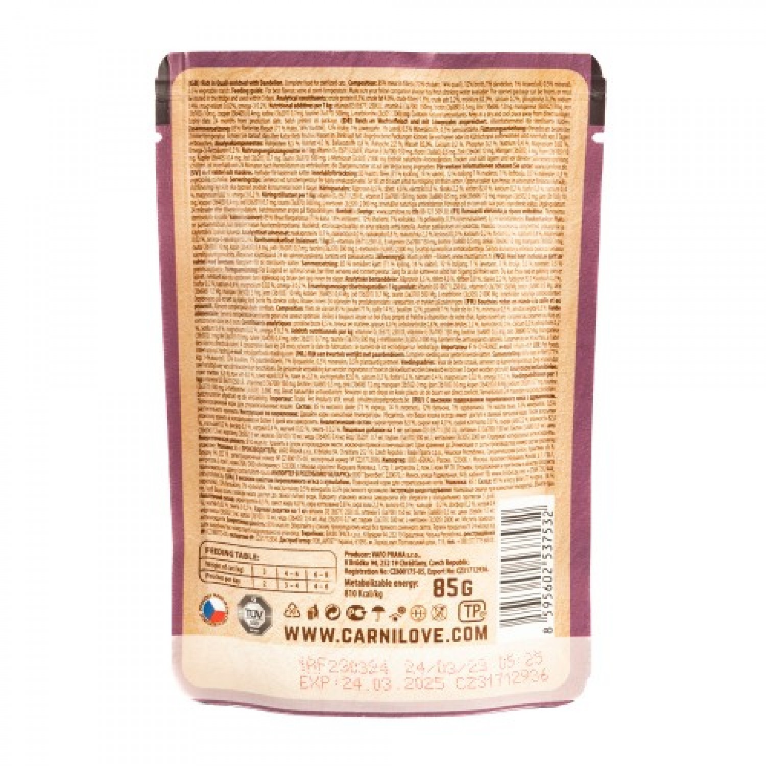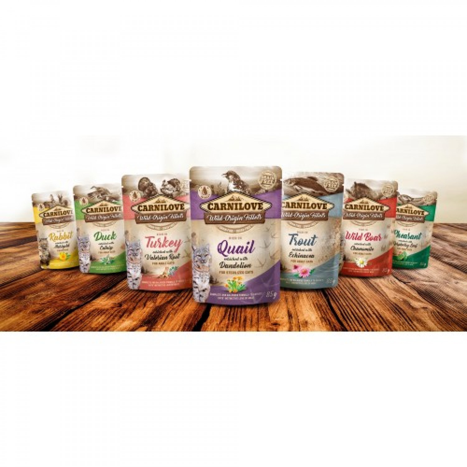 Carnilove rich in Quail enriched with Dandelion (філе дичини в соусі) - повноцінний вологий корм класу холістик для котів. Цей раціон можна використовувати, як основну страву або як доповнення до сухого корму - для надання йому апетитності.