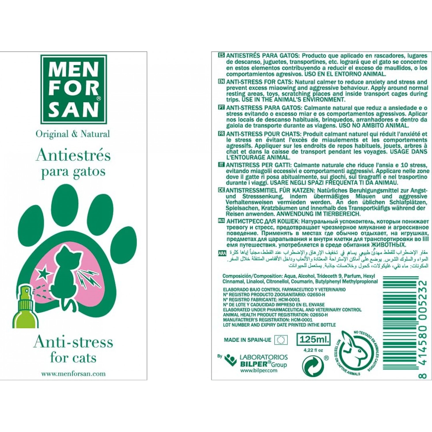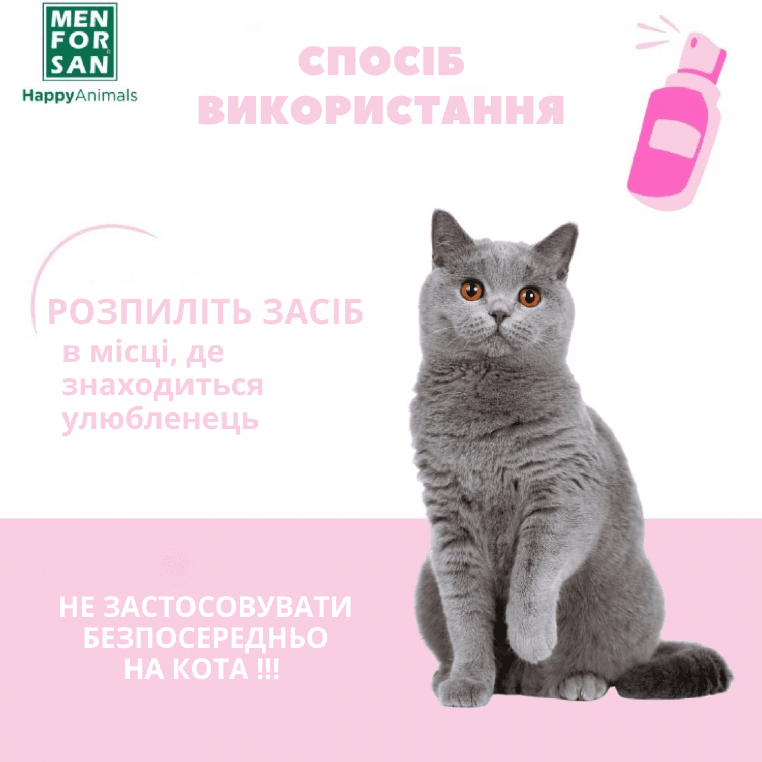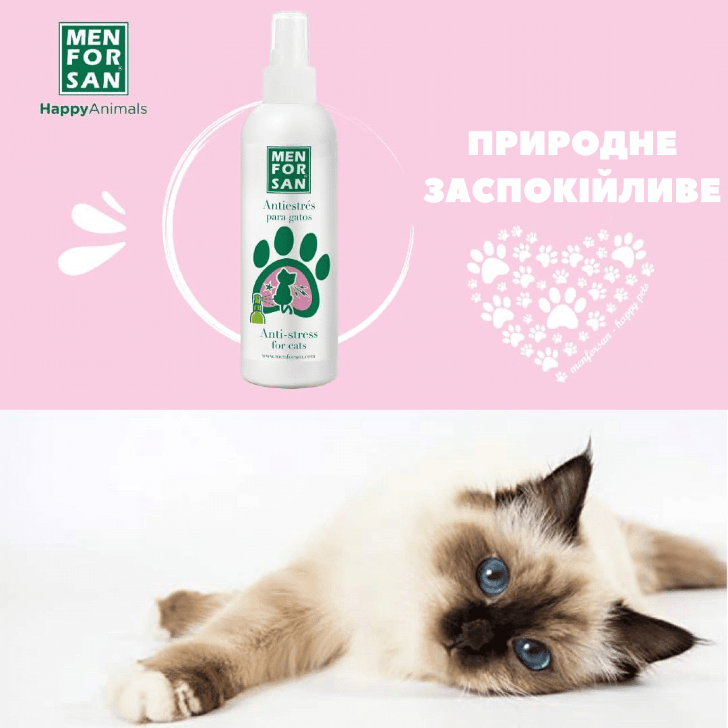 Натуральний спрей для котів для зменшення симптомів стресу. Допомагає знизити та зменшити ознаки стресу та тривоги, спричинені розлукою, занадто довгим перебуванням вдома, періодом спеки, феєрверками, подорожами, новою домашньою твариною вдома, новою домівкою, зміни середовища, гучні звуки, візит до ветеринара, втрата компаньйона, поїздка на автомобілі, хвороба.