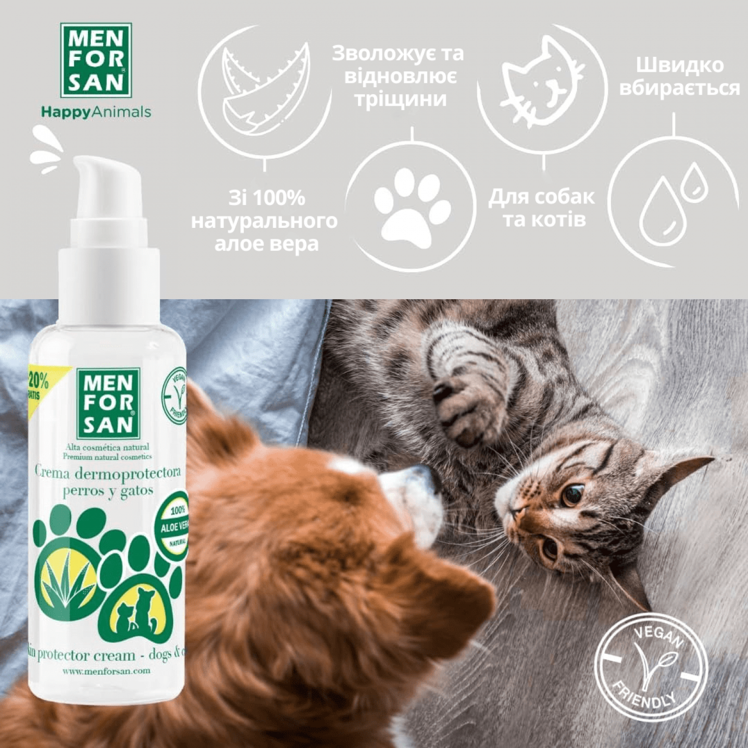 Дермозахисний крем для зовнішнього застосування з натуральним алое вера для догляду за шкірою та загоєння ран у собак і котів. Крем знімає та заспокоює свербіж, спричинений алергічними висипаннями, подразненнями шкіри та укусами комах та сприяє природному загоєнню невеликих ран.