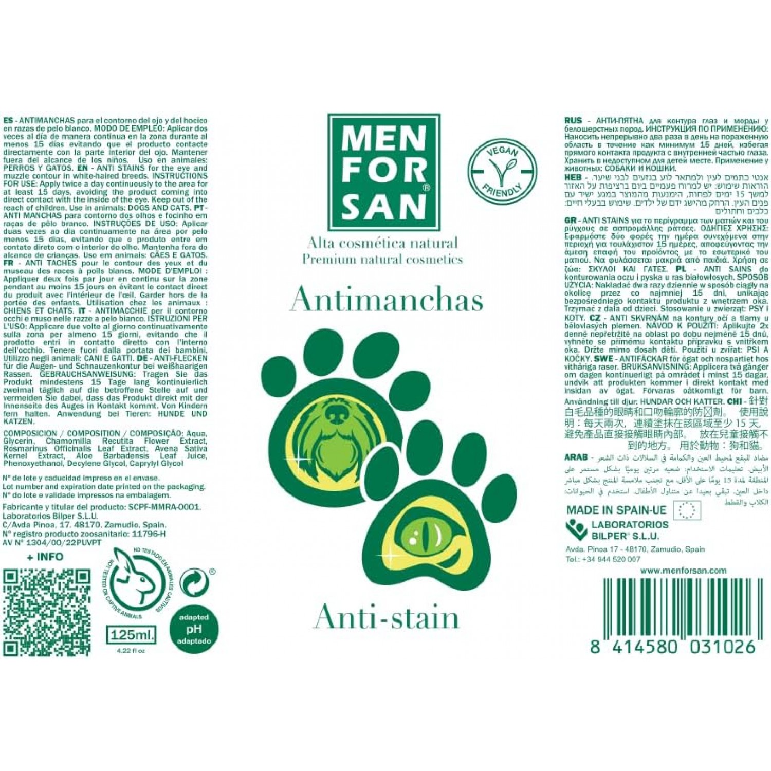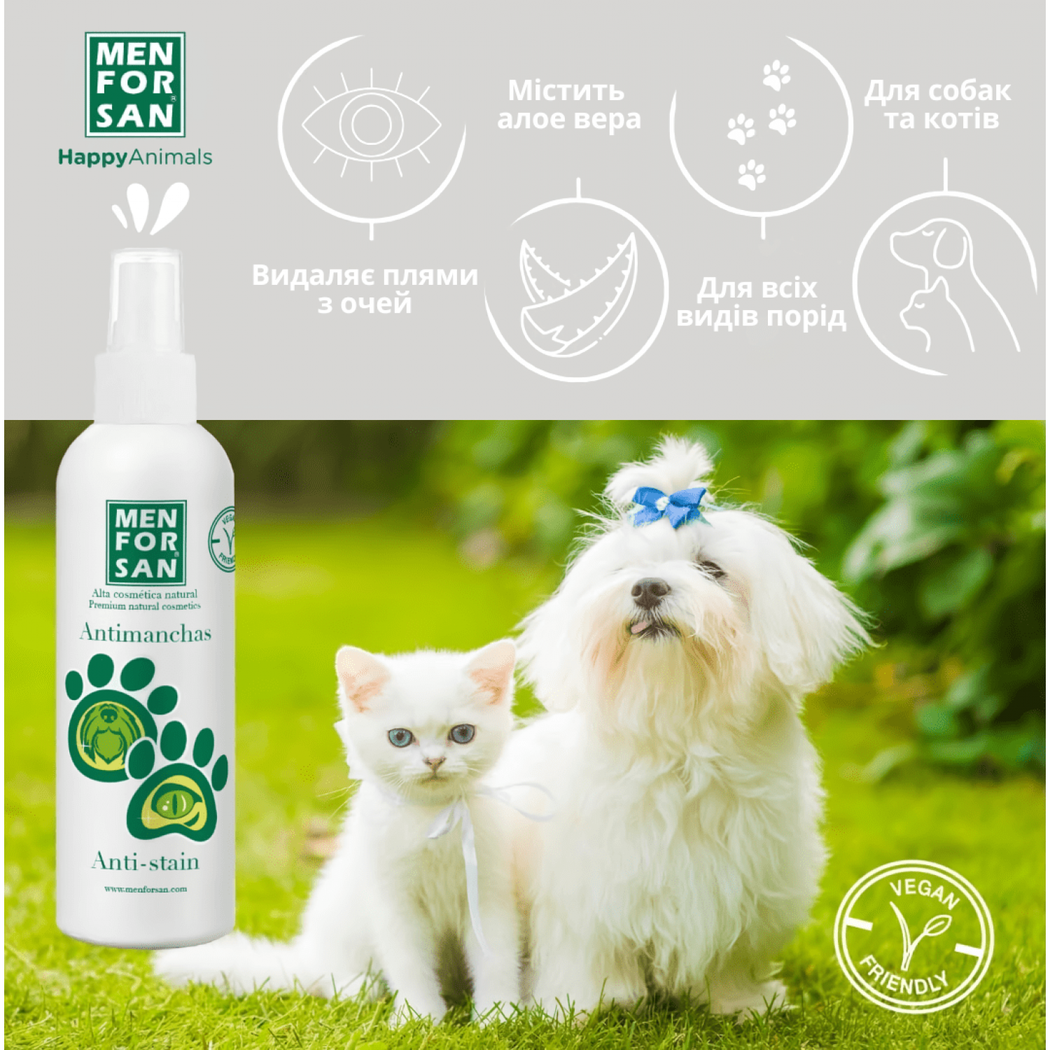 Натуральний засіб проти плям з алое віра, ромашкою та розмарином для собак та кішок. Цей засіб зменшує та видаляє коричневі та темні плями навколо очей та носа, особливо у порід з білою шерстю. Постійне використання цього очищаючого засобу зменшує плями, що утворюються на цих делікатних ділянках, не викликаючи подразнення очей або слизових оболонок.