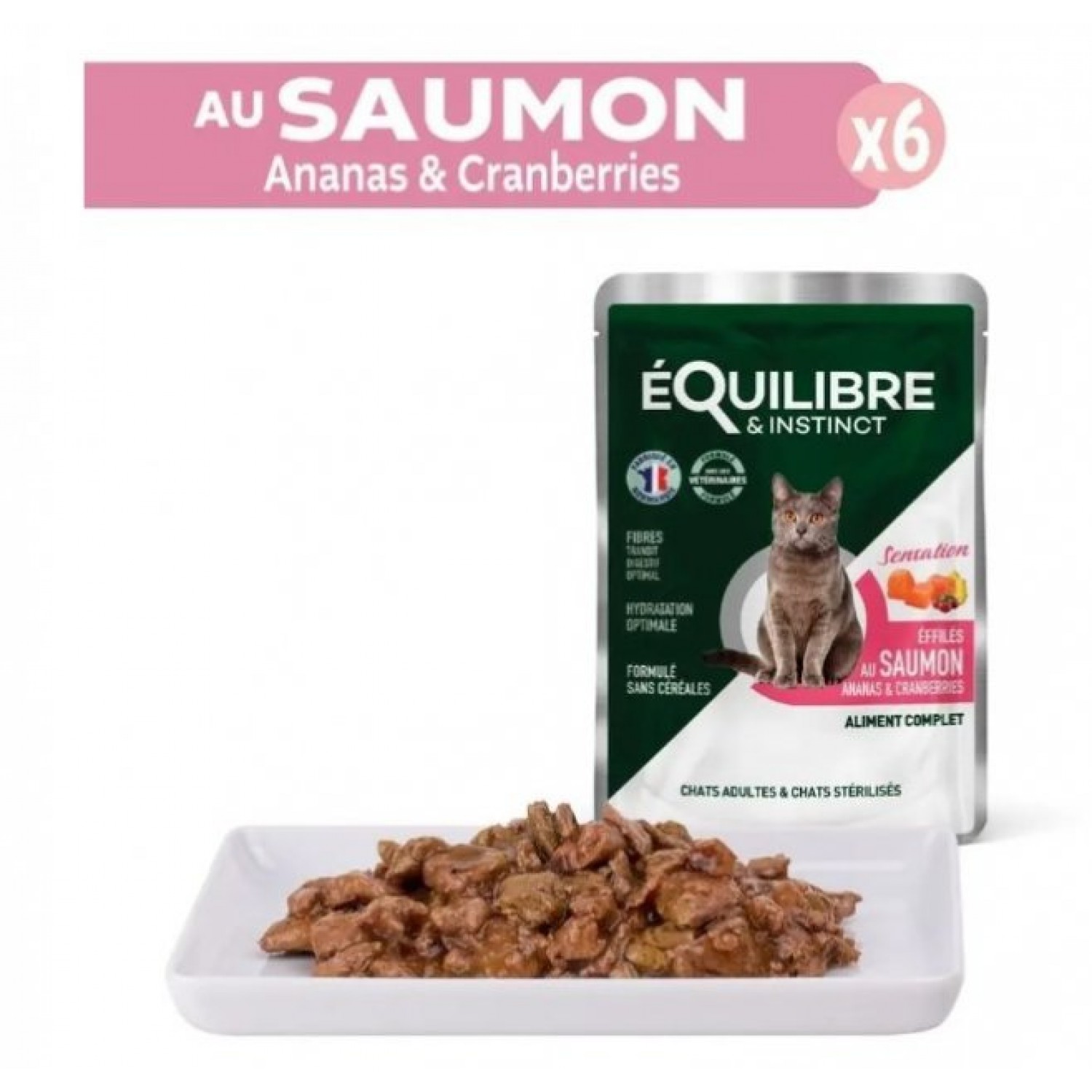 - Шматочки в соусі Equilibre & Instinct для дорослих котів із лососем, ананасом і журавлиною.