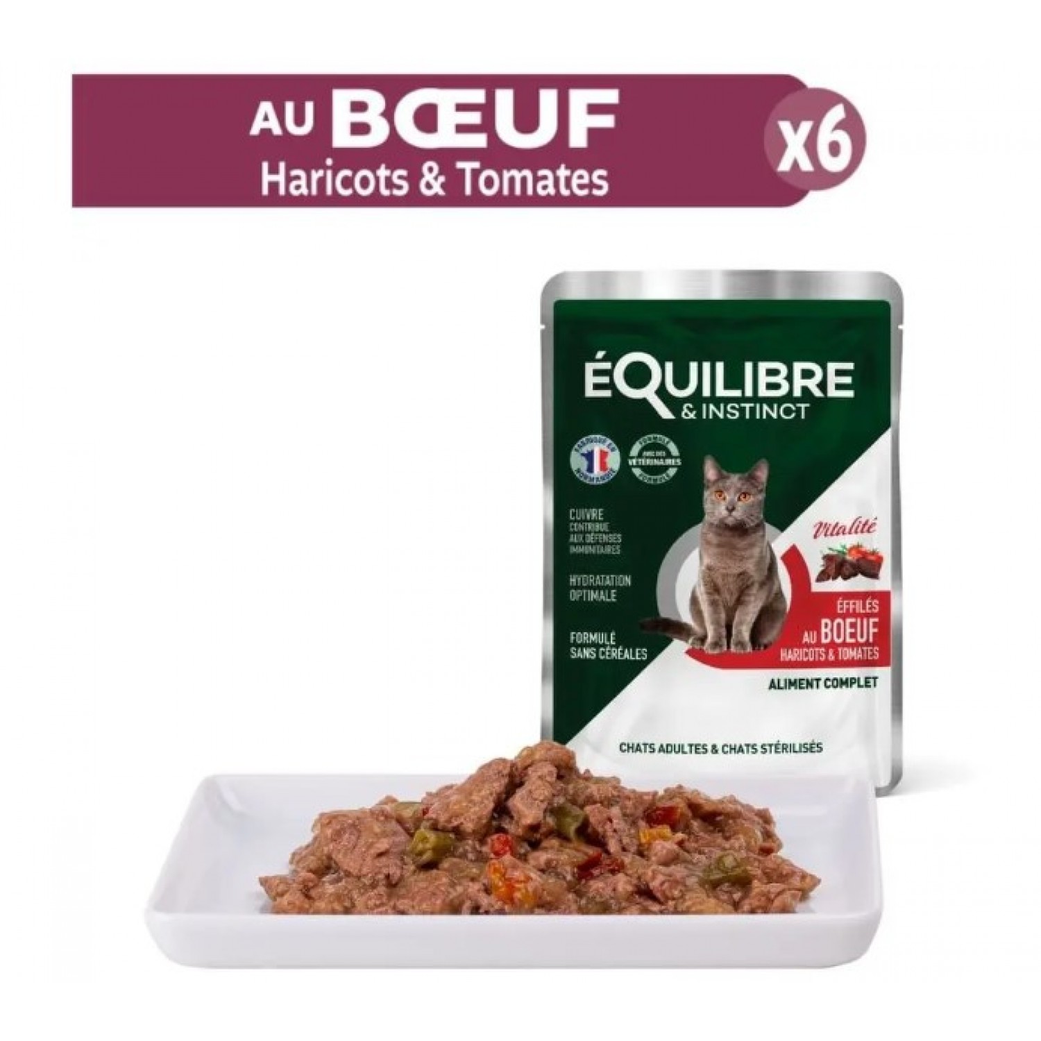 - Шматочки в соусі Equilibre & Instinct для дорослих котів із яловичиною, стручковою квасолею й томатами.