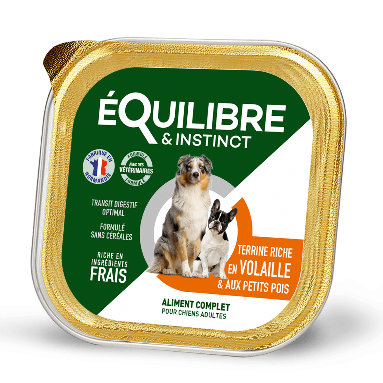 Паштет Equilibre & Instinct для дорослих собак зі свіжим м'ясом птиці та зеленим горошком - продукт має високий вміст свіжого м'яса птиці й задовольнить навіть найвибагливішого собаку.