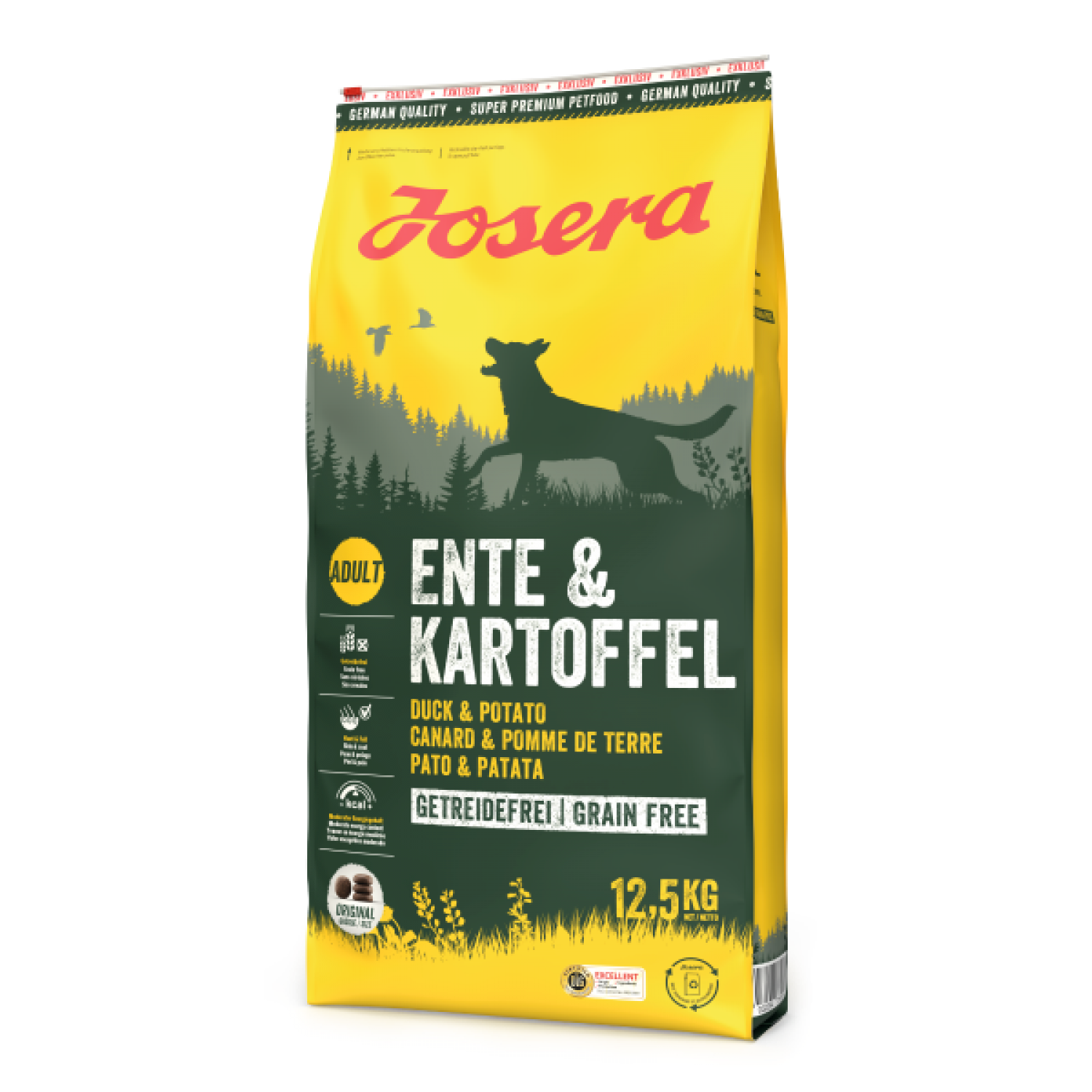 Josera Ente & Kartoffel - беззерновий cухий корм суперпреміум класу для собак з качкою та картоплею. Корм містить 26% сушеного качиного м'яса в якості єдиного джерела тваринного білка, що відповідає приблизно 85 г свіжого м’яса на 100 г сухого корму. Цінні жирні кислоти та біотин додатково підтримують здоров’я шкіри та блиск шерсті.