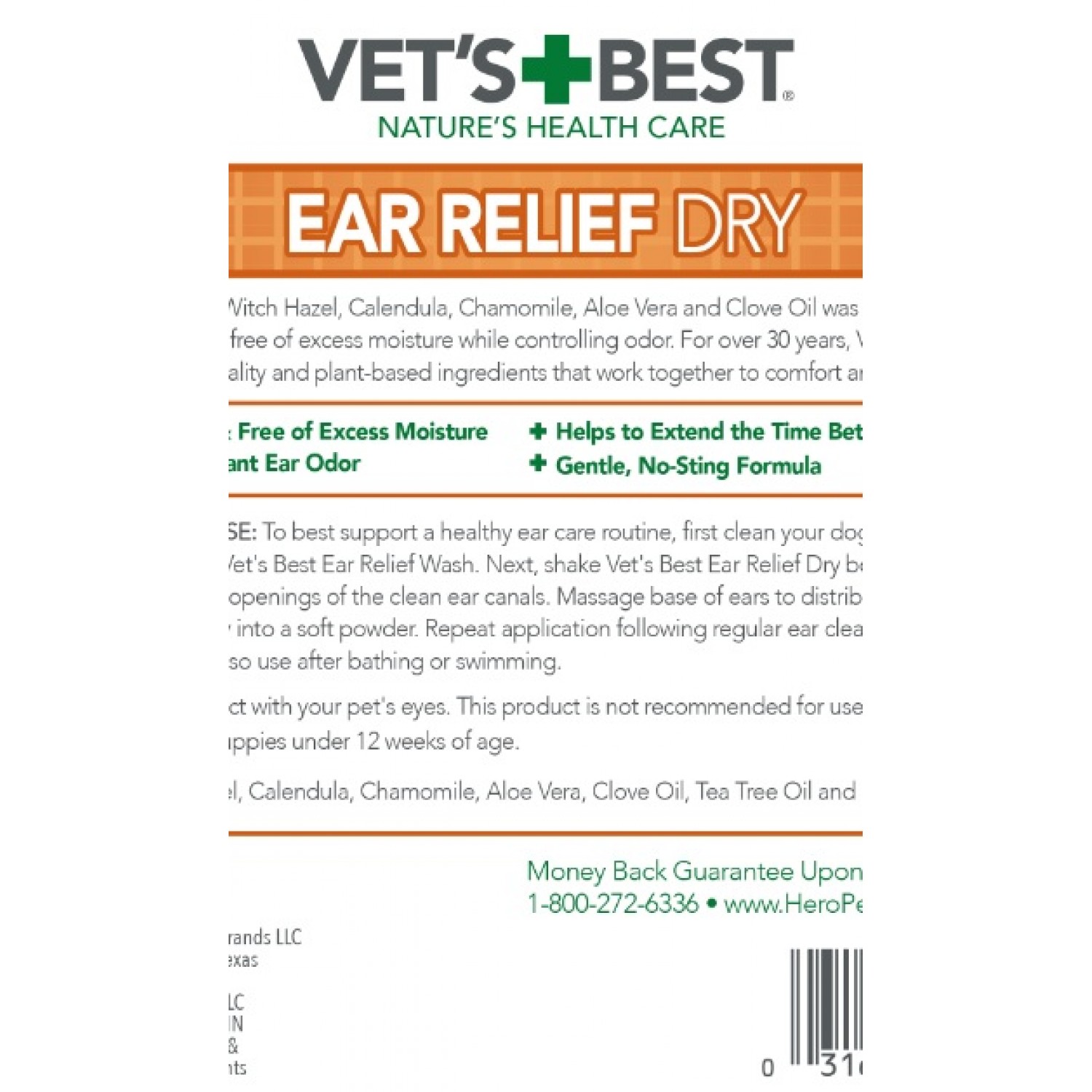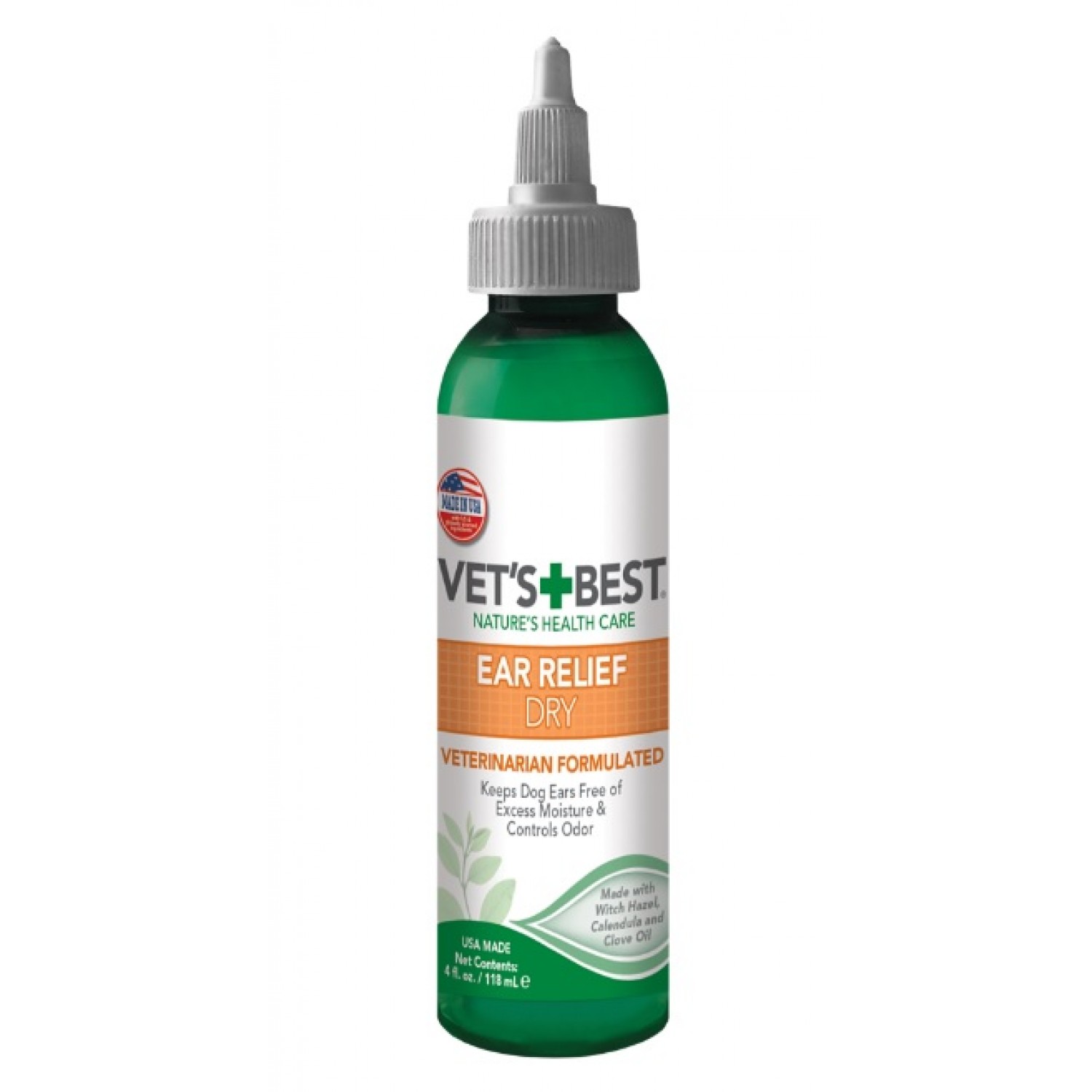 Засіб для догляду за вухами собак Vet's Best Ear Relief Dry містить комплекс з олії чайного дерева, ромашки та ехінацеї, розроблений спеціально для дбайливого очищення, заспокоєння й усунення свербіння, подразнень, почервоніння, попрілостей та забруднень вух, допомагає підтримувати вушний канал сухим.