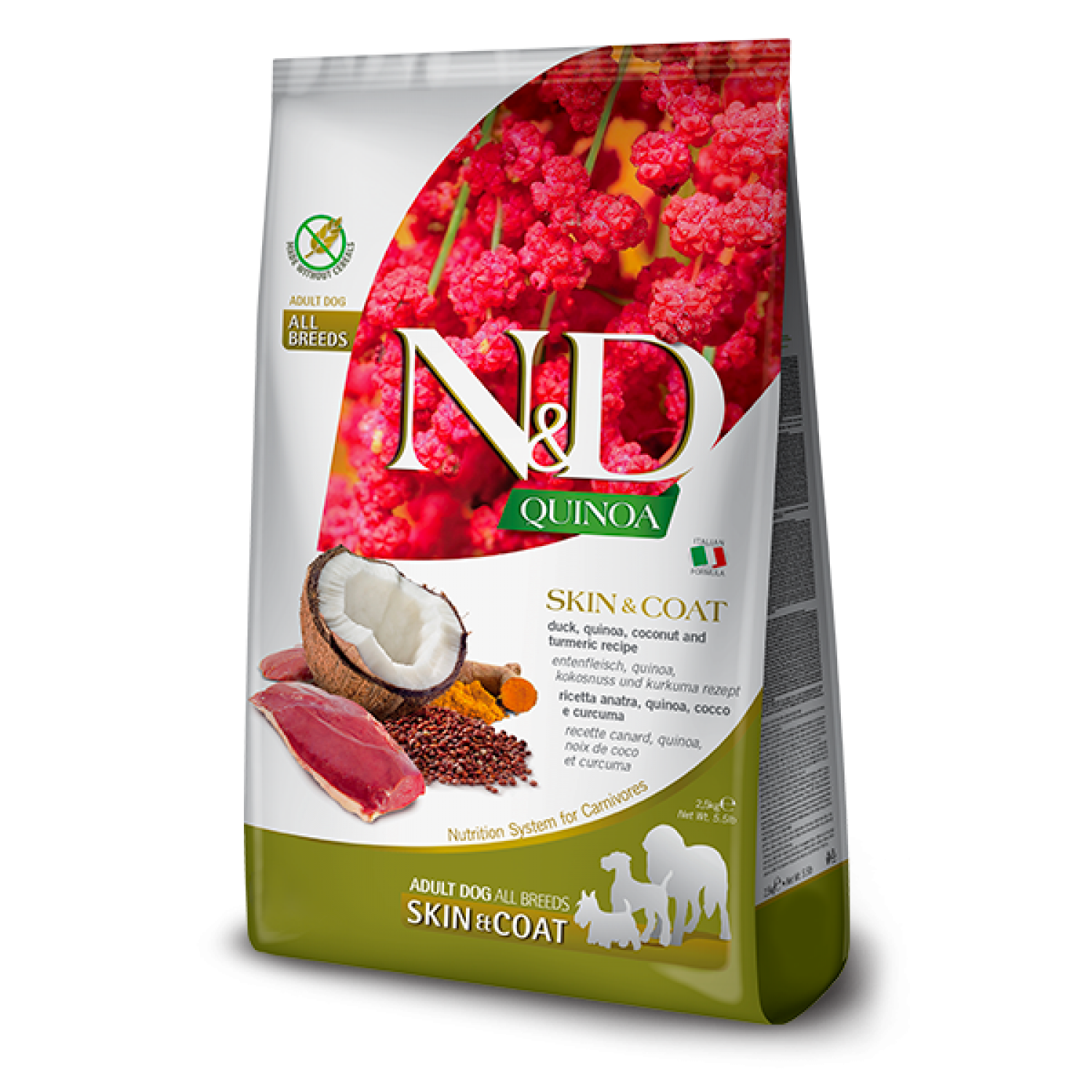 Farmina N&D Quinoa Dog Adult All Breeds Skin & Coat Quail & Coconut сухий корм для собак всіх порід із качкою, кіноа, кокосом і куркумою.