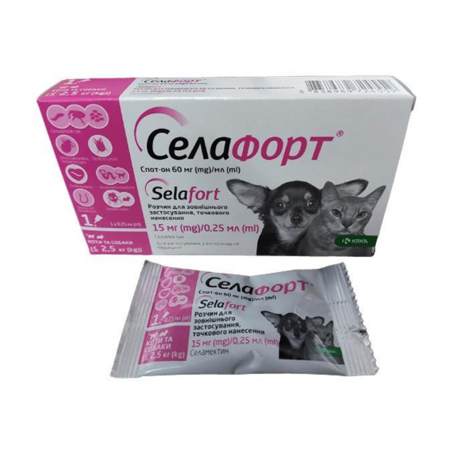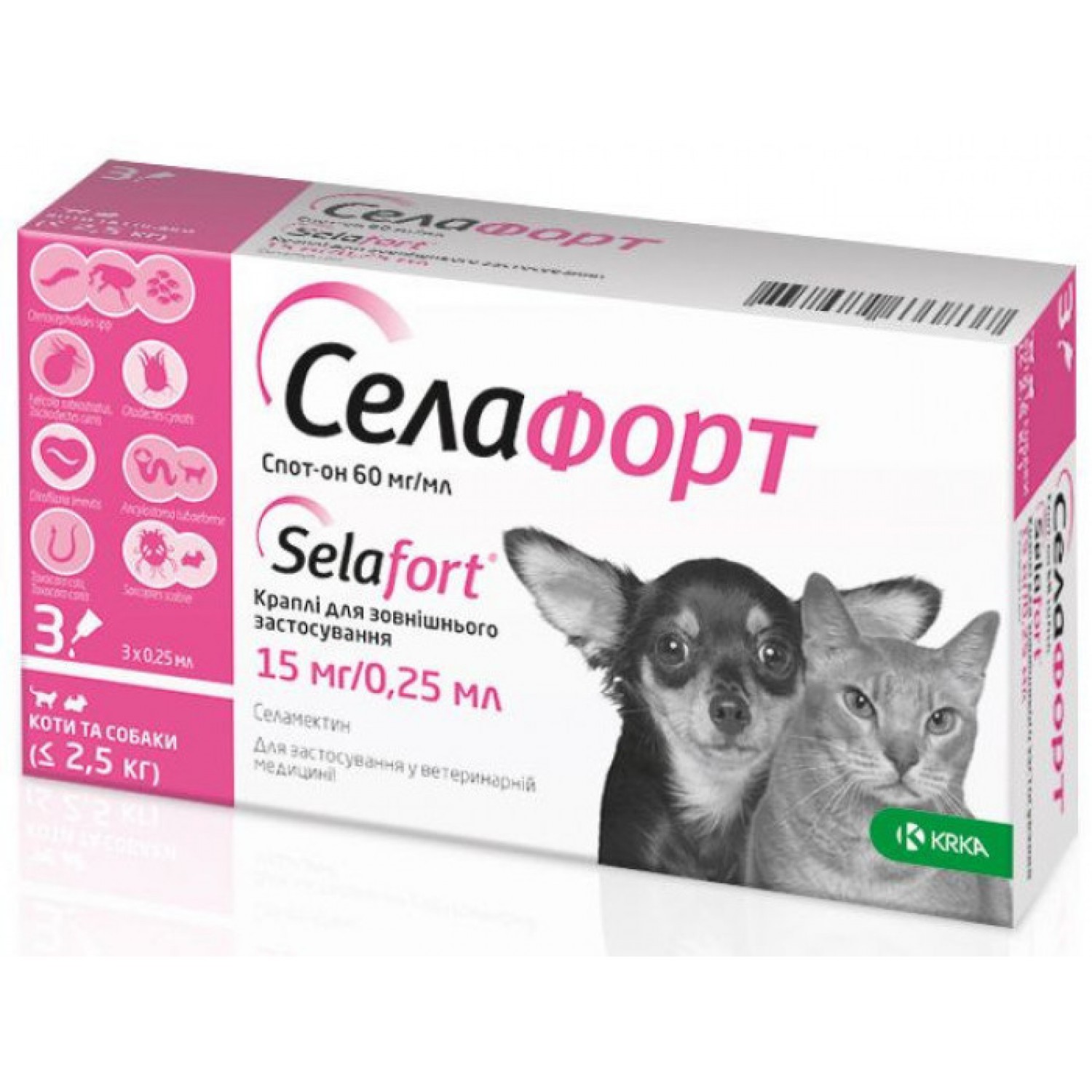 Селафорт для кішок і собак <2,5 кг призначений для одночасного захисту від зовнішніх і внутрішніх паразитів. Застосовується для профілактики і лікування энтомозів, викликаних блохами, вошами і волосоїдами, отодектозу, саркоптоз, а також гельмінтозів (анкилостомоза і токсокарозу) та профілактики дирофіляріозу (зараження серцевим хробаком).