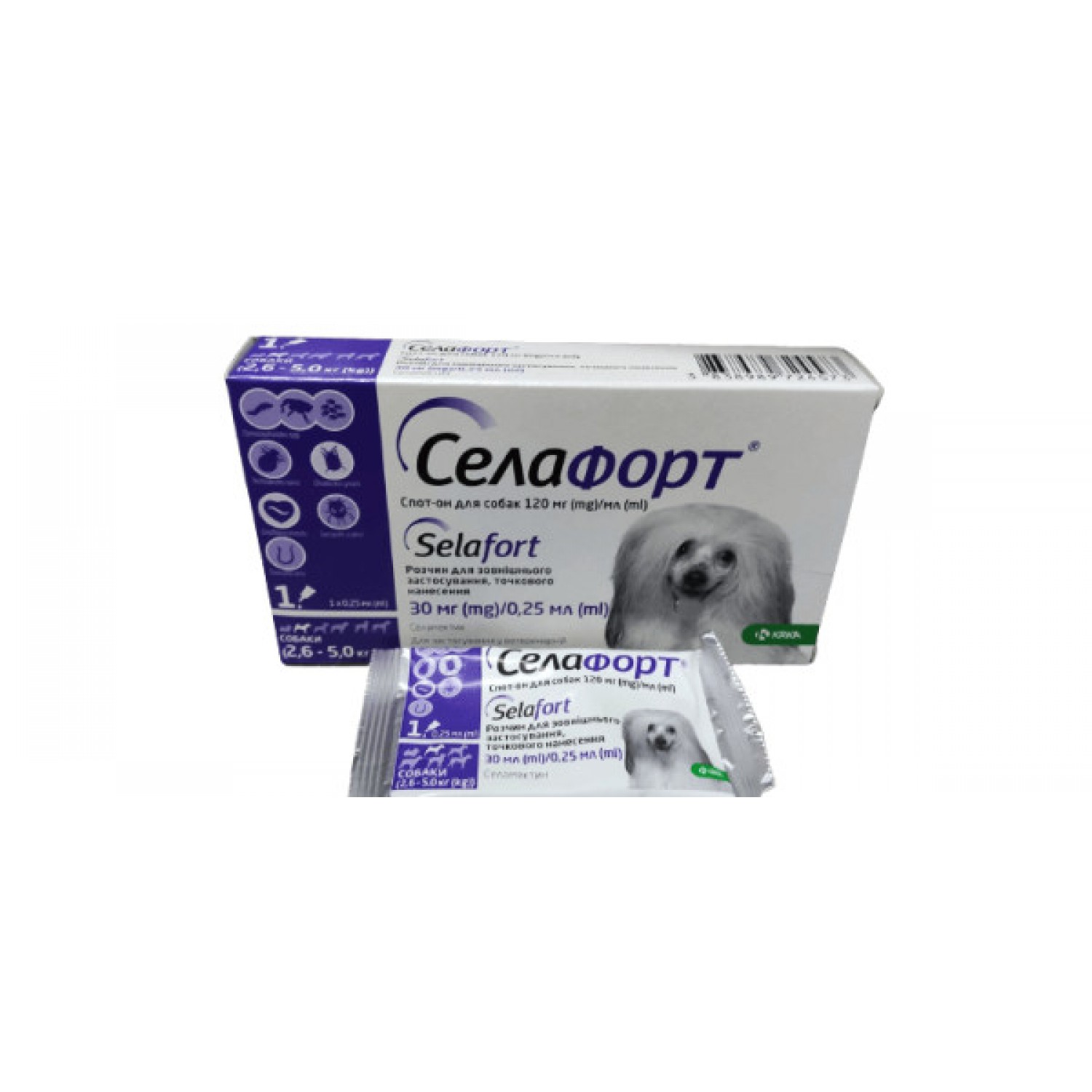 Селафорт для собак від 2,6 до 5 кг призначений для одночасного захисту від зовнішніх і внутрішніх паразитів. Застосовується для профілактики і лікування энтомозов, викликаних блохами, вошами і волосоїдами, отодектозу, саркоптоз, а також гельмінтозів (анкилостомоза і токсокарозу) та профілактики дирофіляріозу (зараження серцевим хробаком).