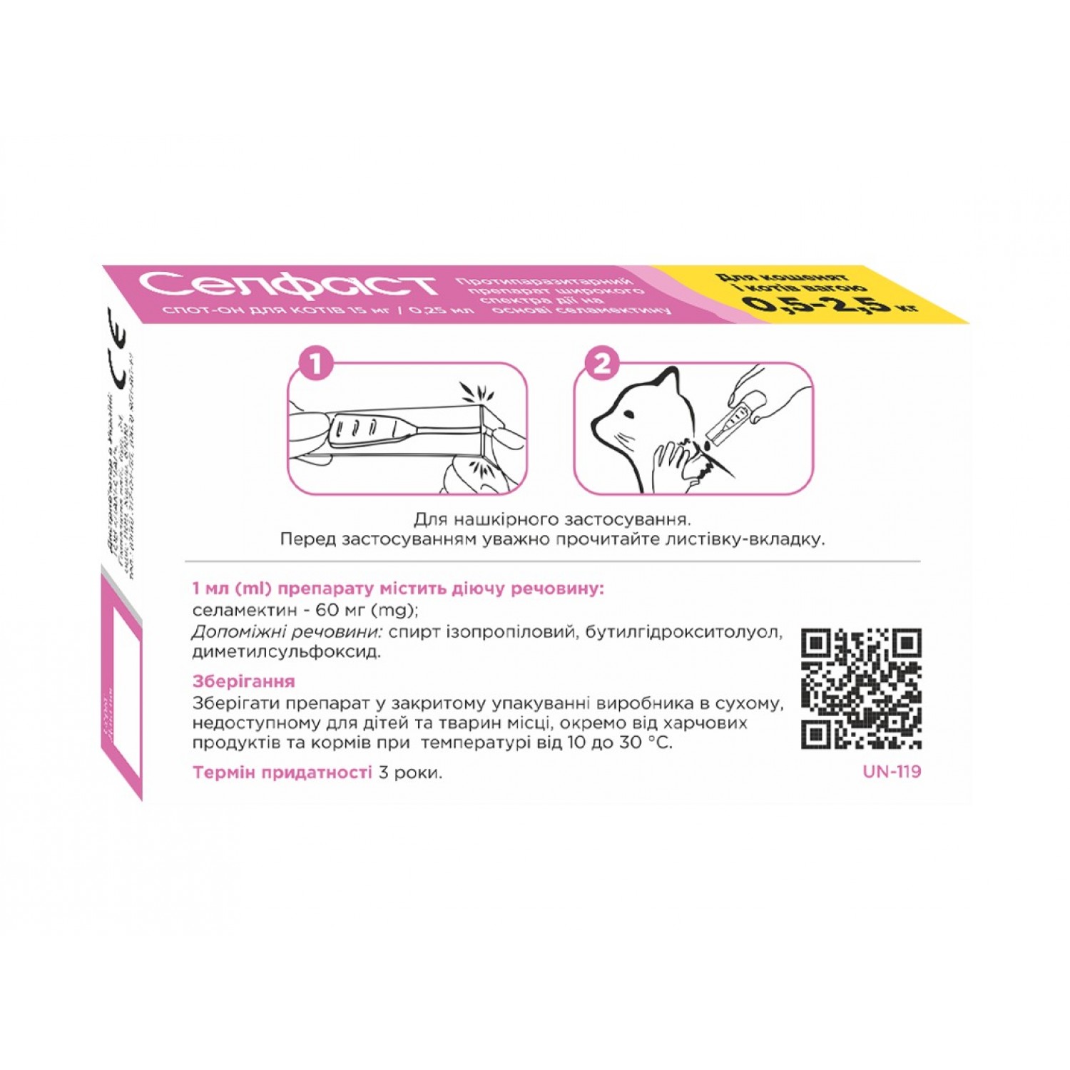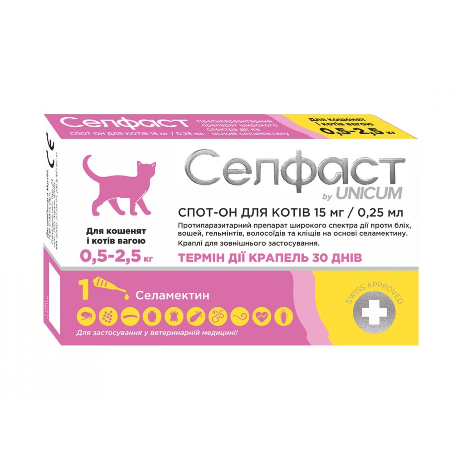 Селфаст Unicum - це протипаразитарний лікарський засіб, призначений для котів. Препарат широкого спектра дії проти бліх, вошей, гельмінтів, волосоїдів та кліщів на основі селемектину, що володіє широким спектром дії. Селфаст Unicum максимально безпечний для тварин (3 клас небезпеки), і в рекомендованих дозах не викликає місцево-дратівливого, резорбтивно-токсичного або сенсибілізуючого ефекту.