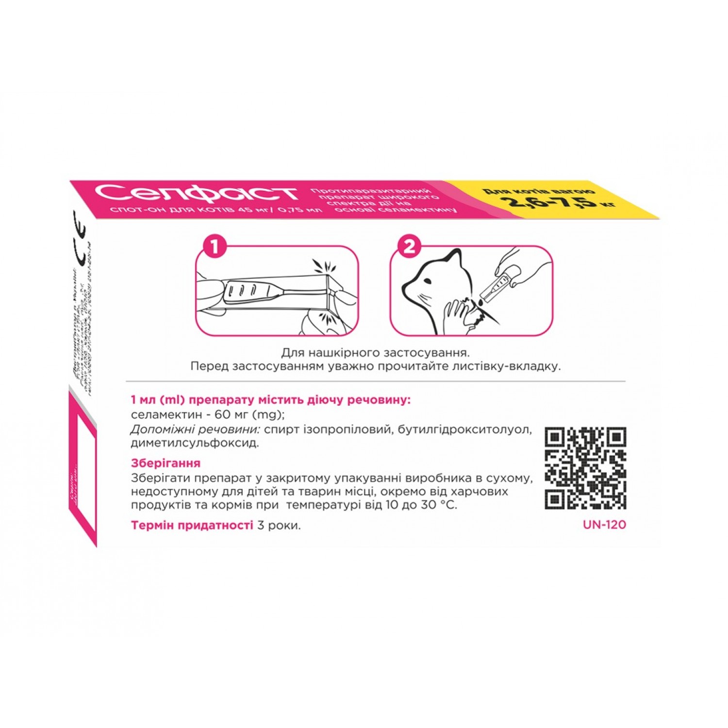 Селфаст Unicum - це протипаразитарний лікарський засіб, призначений для котів. Препарат широкого спектра дії проти бліх, вошей, гельмінтів, волосоїдів та кліщів на основі селемектину, що володіє широким спектром дії. Селфаст Unicum максимально безпечний для тварин (3 клас небезпеки), і в рекомендованих дозах не викликає місцево-дратівливого, резорбтивно-токсичного або сенсибілізуючого ефекту.