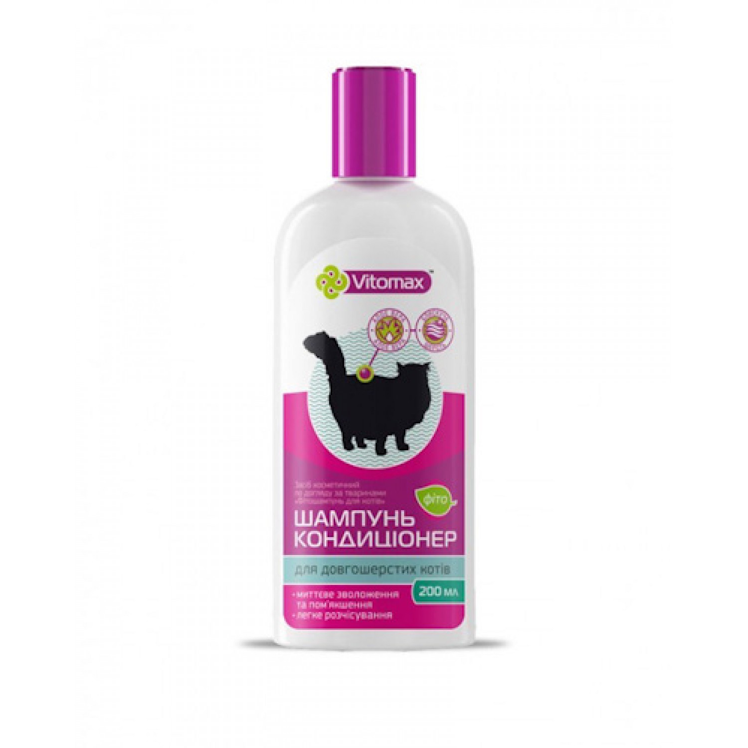 Фітошампунь ТМ Vitomax - натуральний шампунь-кондиціонер для довгошерстих котів на основі екстрактів рослин, корисних для шкіри та вовни. Має протипаразитарний ефект.