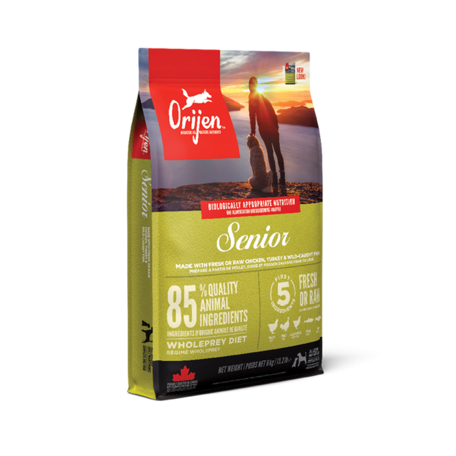 Раціон ОРІДЖЕН Сеньйор на 85% сповнений якісними м’ясними інгредієнтами, такими як курча та індичка, вирощені на вільному вигулі, та риби, виловленої в дикій природі або екологічно вирощеної на фермах. Сповнений м’ясними інгредієнтами у співвідношенні WholePrey, такими як високопоживні органи та їстівні кістки, раціон виготовлений з найбільш поживних та соковитих частин здобичі, для того, щоб забезпечити собак харчуванням, якого вони потребують. Як результат раціон для вашого улюбленця поза будь-якими порівняннями.