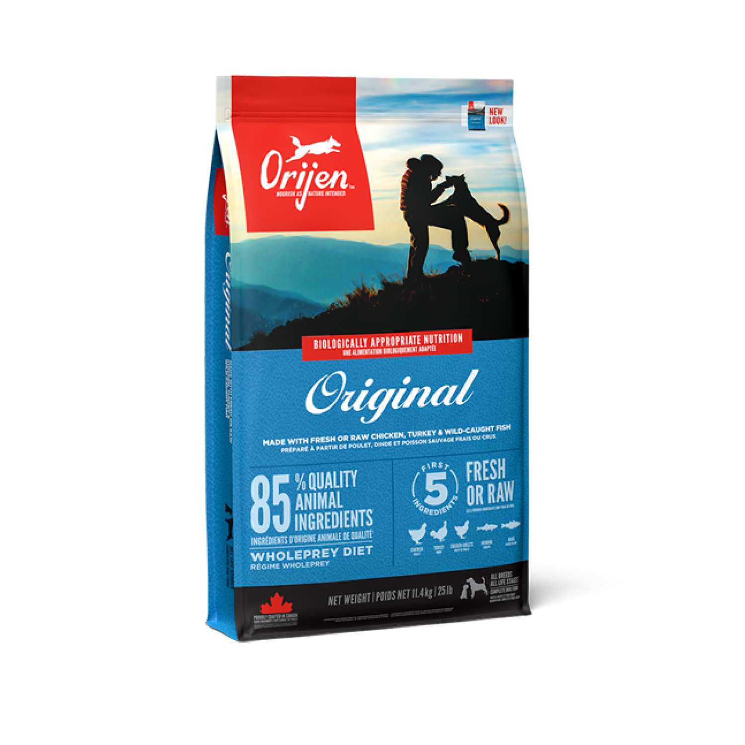 Раціон ОРІДЖЕН Оріджинал на 85% сповнений якісними м’ясними інгредієнтами, такими як курча та індичка, вирощені на вільному вигулі, та риби, виловленої в дикій природі або екологічно вирощеної на фермах. Сповнений м’ясними інгредієнтами у співвідношенні WholePrey, такими як високопоживні органи та їстівні кістки, раціон виготовлений з найбільш поживних та соковитих частин здобичі, для того, щоб забезпечити собак харчуванням, якого вони потребують. Як результат раціон для вашого улюбленця поза будь-якими порівняннями.