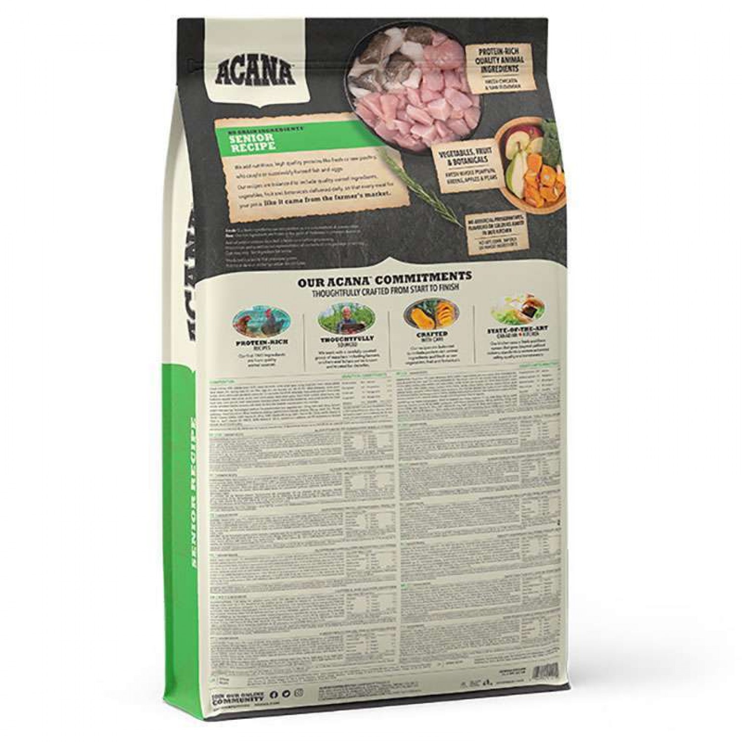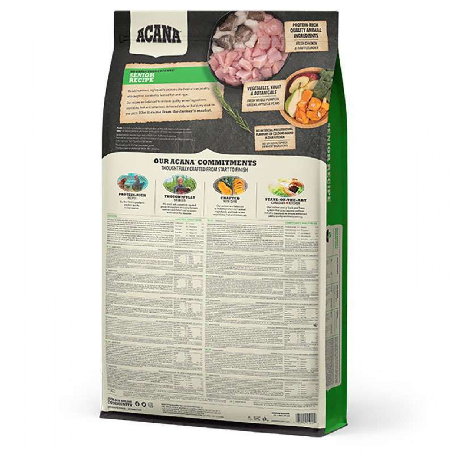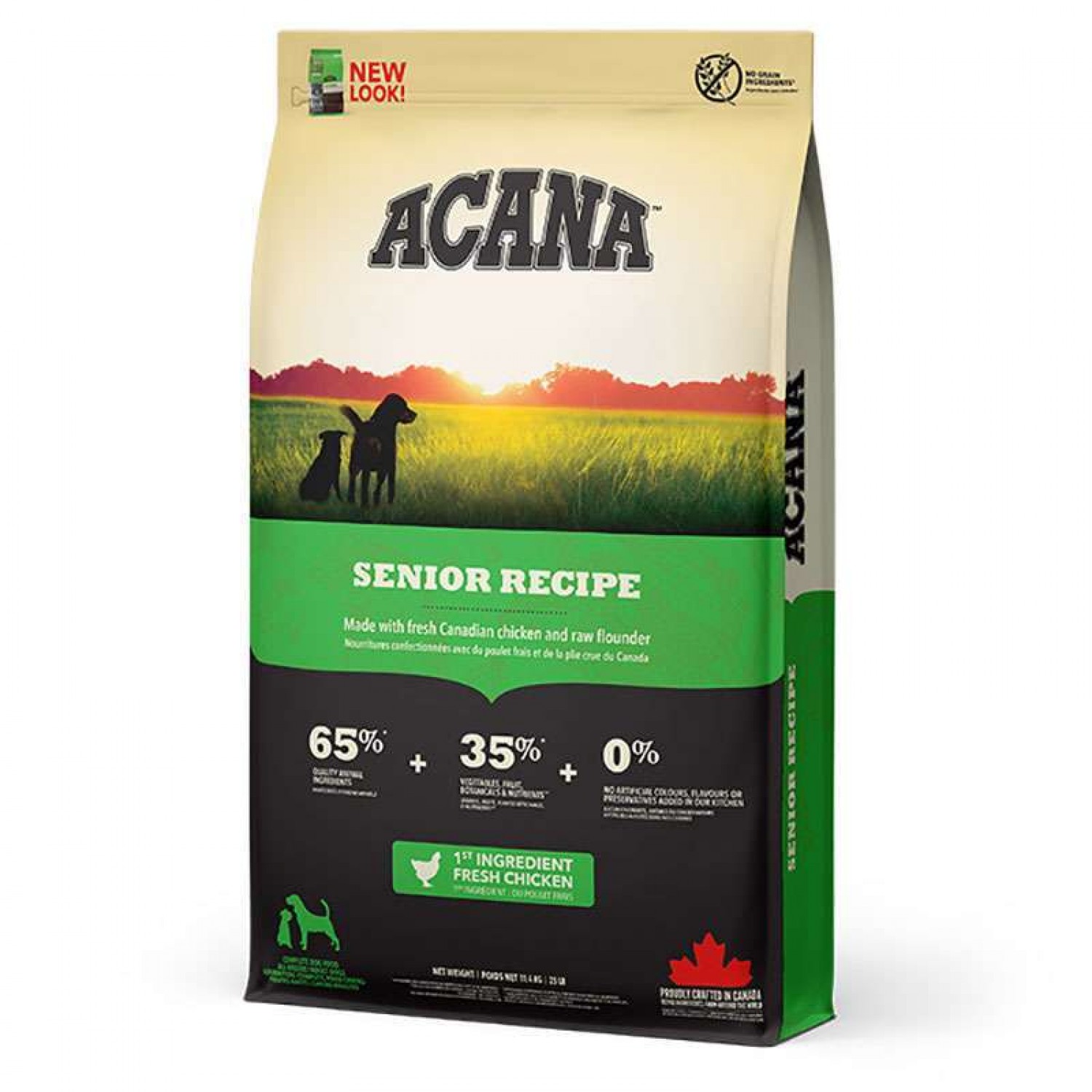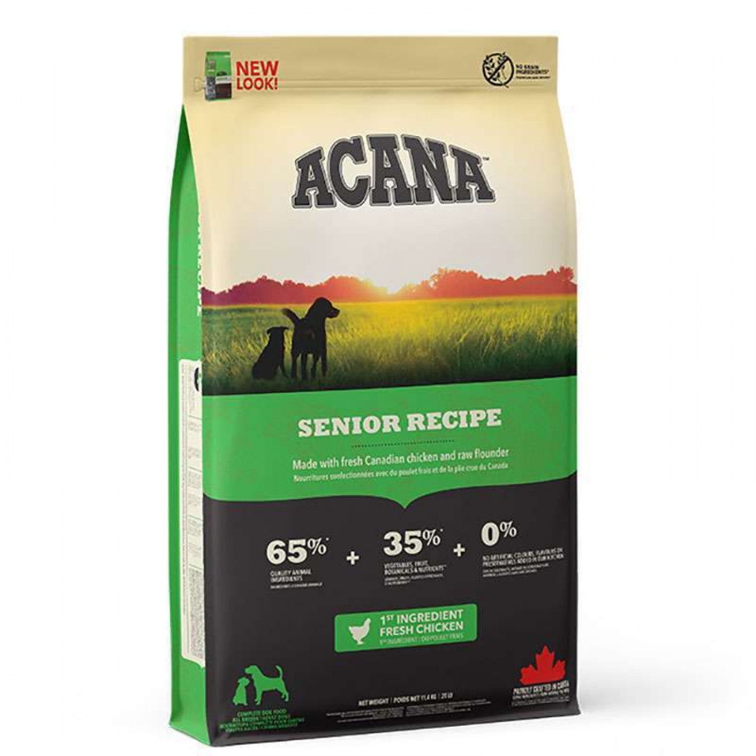 Коли це стосується корму ACANA, кожен інгредієнт має значення. Саме тому, рецептура Senior Recipe створюється з турботою щоб забезпечувати здоров’я старіючих собак. Рецептура АКАНА Сеньйор Ресіпе на 65% переповнена якісними м’ясними інгредієнтами, такими як м’ясо канадських курчат та сирої камбали та на 35% збалансована фруктами, овочами та травами.