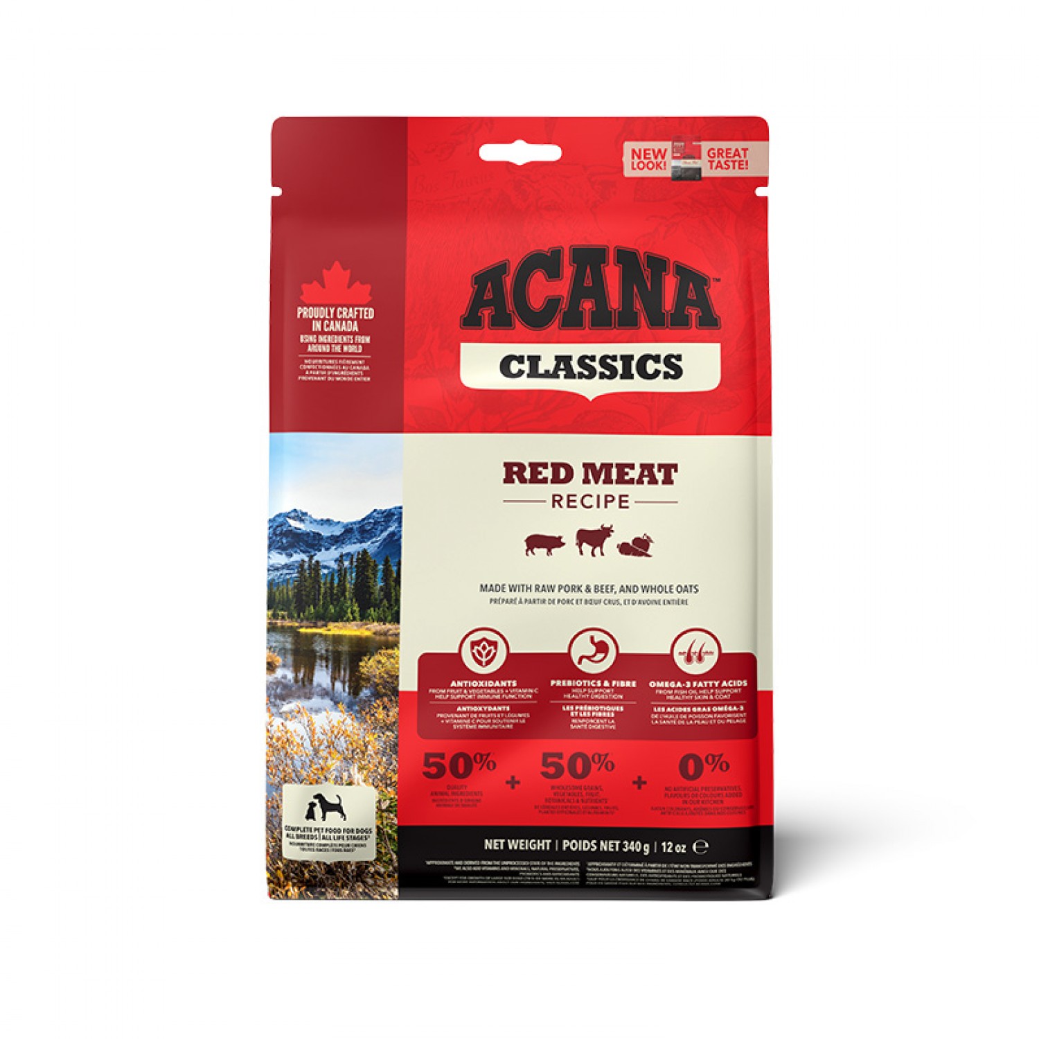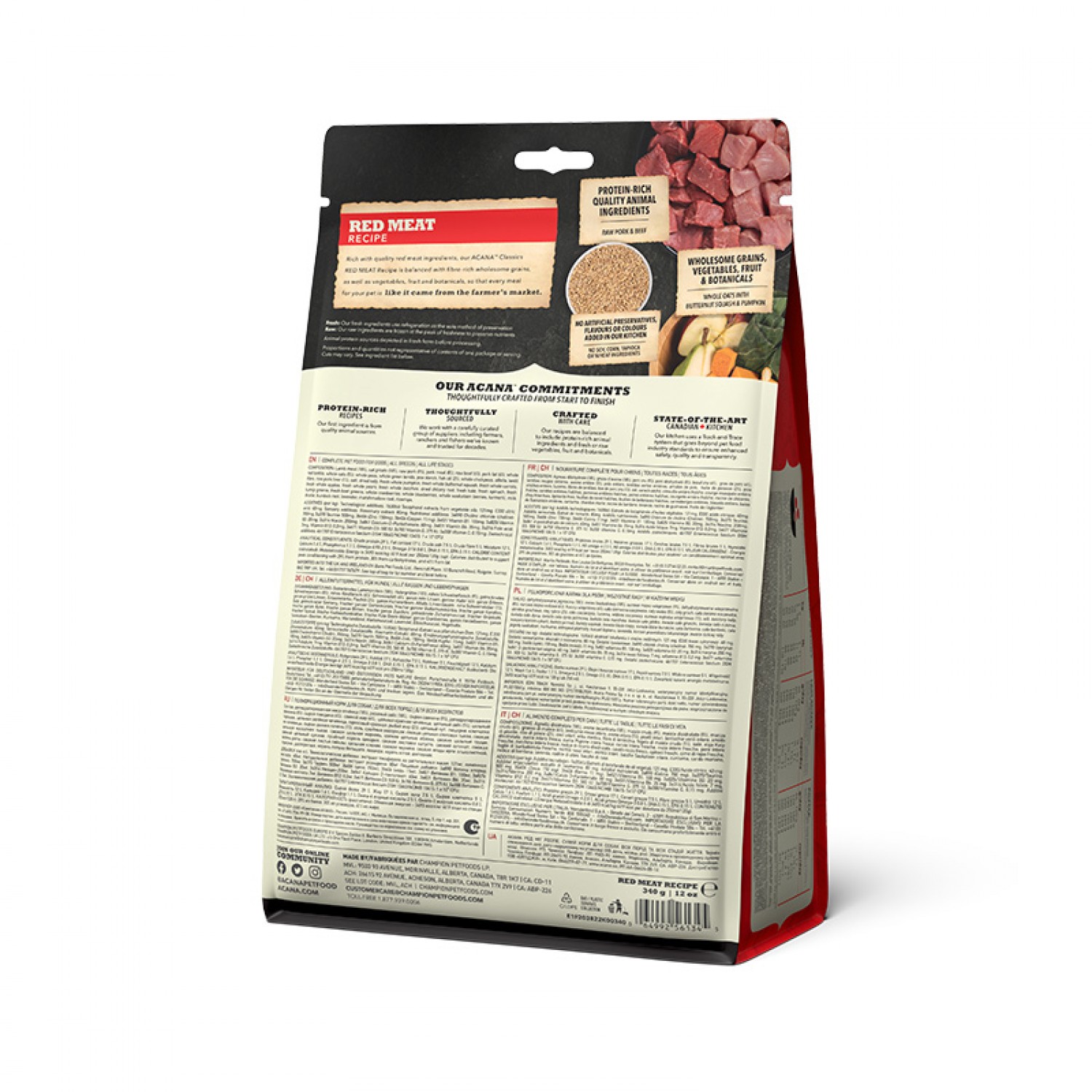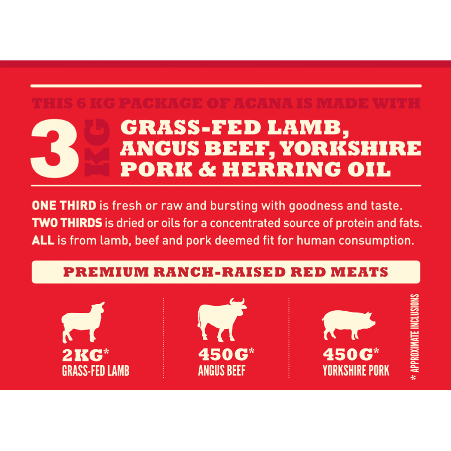 Повнораціонний сухий корм на основі червоного м’яса та вівса для собак усіх порід і вікових груп. Є відображенням природного раціону собак, містить багато високозасвоюваних тваринних білків і мало непотрібних вуглеводів, що біологічно відповідає потребам улюбленця в співвідношенні поживних речовин. Рецептура включає високопоживні інгредієнти, що забезпечують підтримку ключових запорук здоров’я, включаючи імунну функцію, здоров’я травлення та здоров’я шкіри та шерсті. Рецептури ACANA ретельно готуються зі смачних та якісних інгредієнтів, від початку і до кінця.