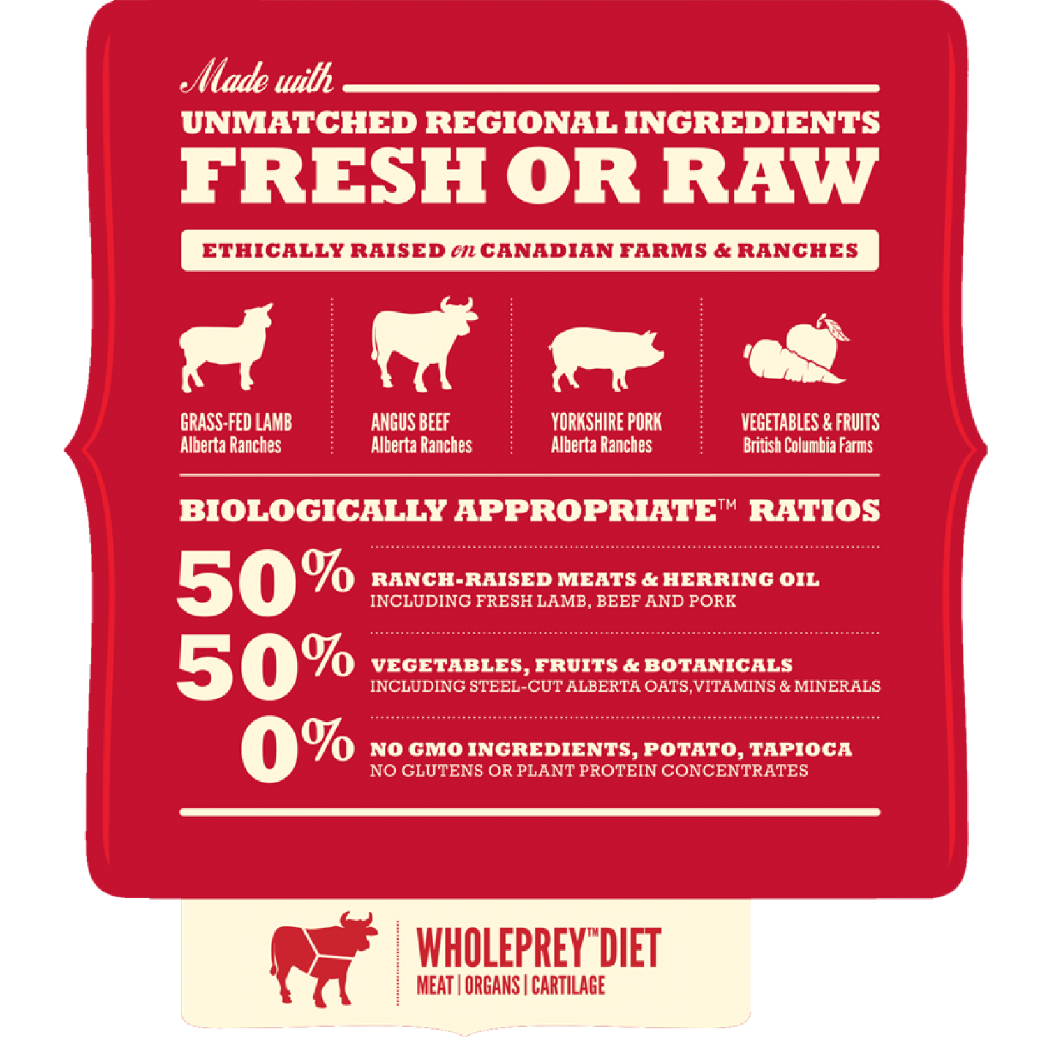 ACANA Red Meat Recipe створений відповідно до рівнів поживності, встановлених FEDIAF для собак всіх стадій життя, за виключенням собак великих порід в період зростання (вага дорослої собаки 30 кг та більше).