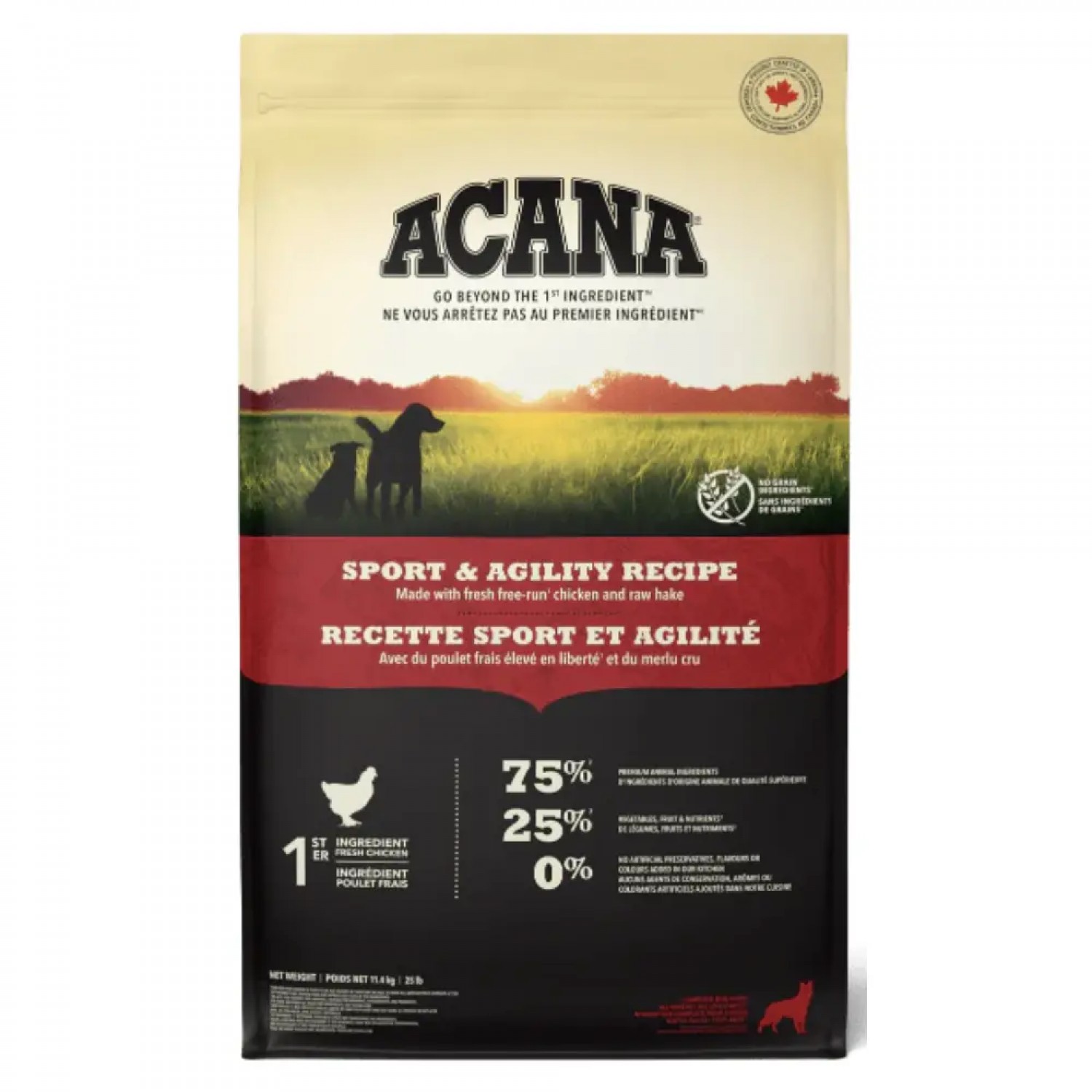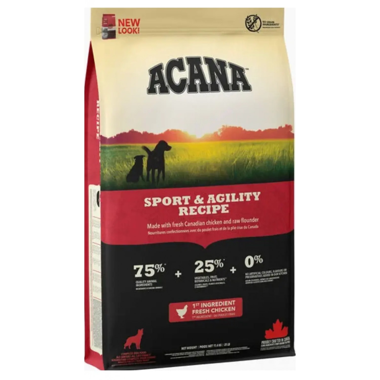 Коли це стосується корму ACANA, кожен інгредієнт має значення. Саме тому рецептура корму ACANA Sport & Agility Recipe створюється з турботою, щоб забезпечувати всі потреби дорослих активних собак у харчуванні. Рецептура АКАНА Спорт енд Аджиліті Ресіпе на 75 % переповнена якісними м'ясними інгредієнтами, такими як м'ясо канадських курчат та сирої камбали та на 25 % збалансована фруктами, овочами та травами.