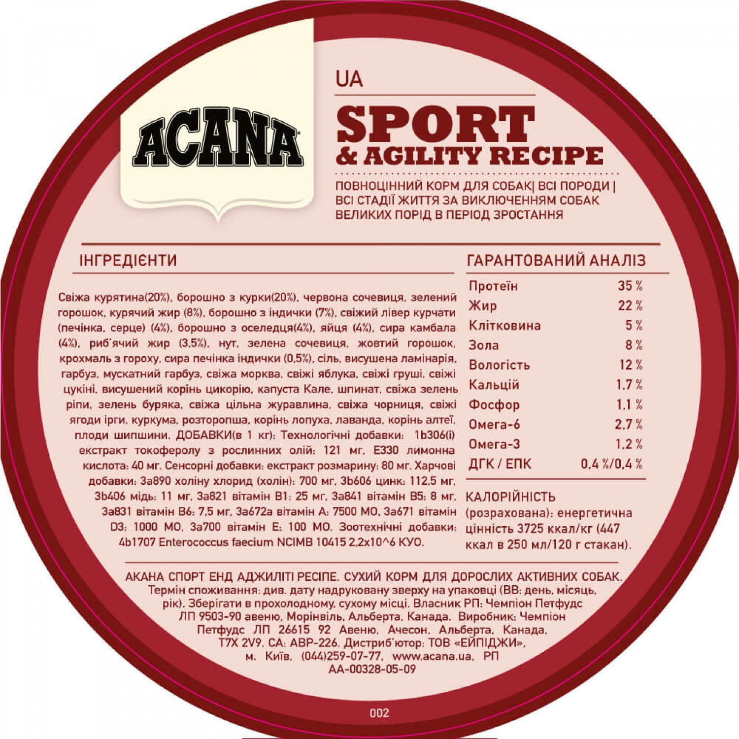 Раціон ACANA Sport & Agility  створений відповідно до рівнів поживності встановлених FEDIAF для собак всіх стадій життя, включаючи собак великих порід в період зростання.