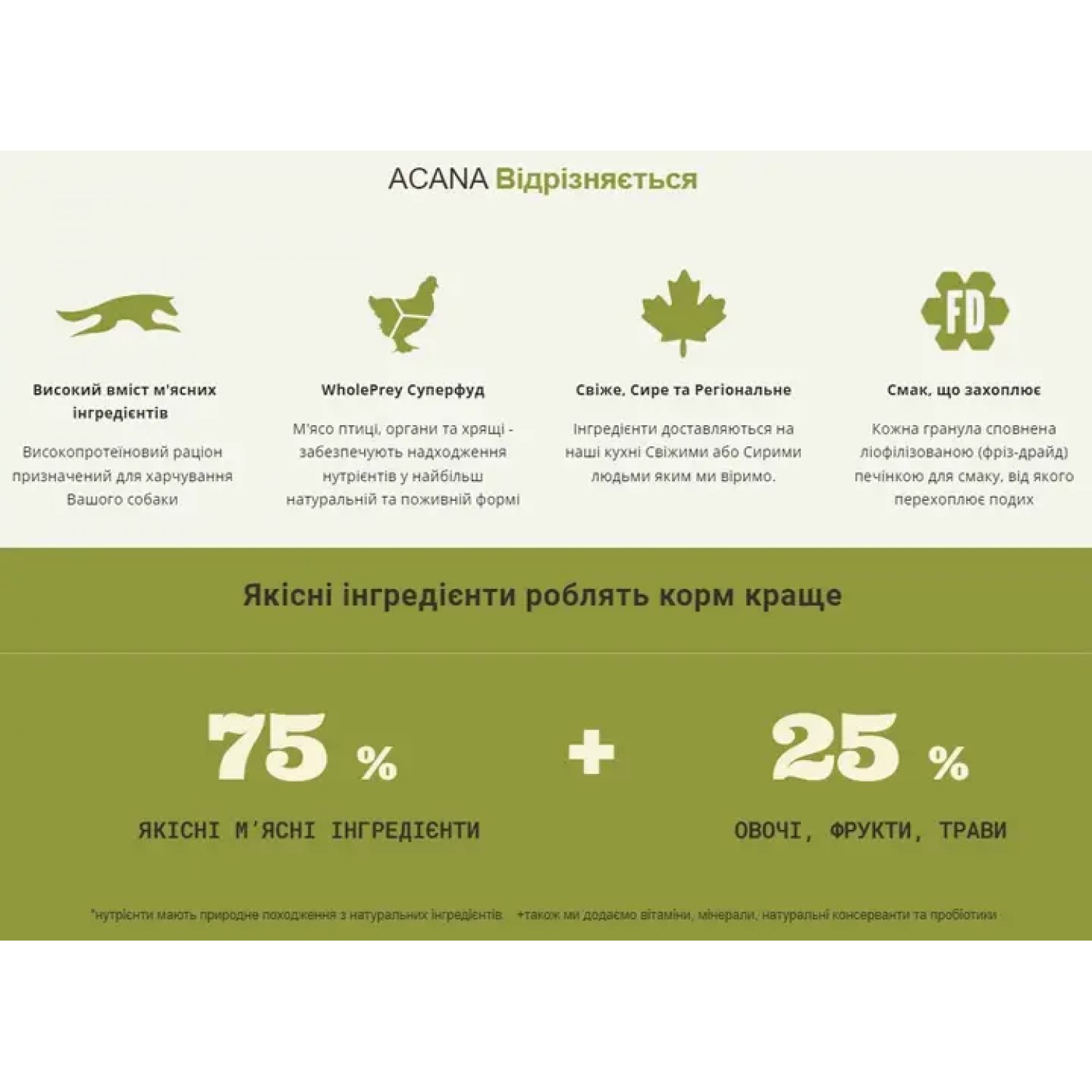 • Виготовлено виключно зі свіжих регіональних інгредієнтів Канади, які завжди доставляються на виробництво свіжими і цільними.