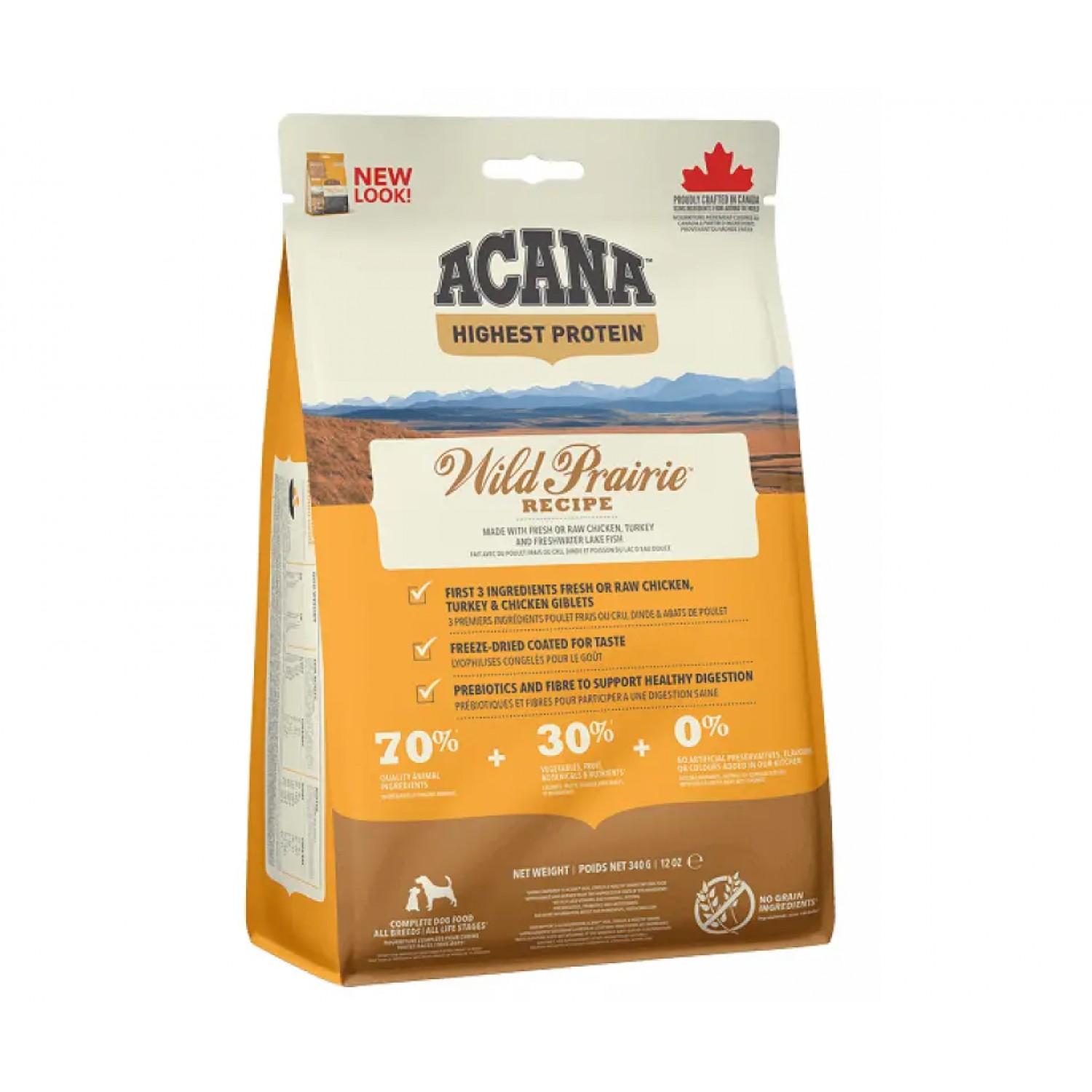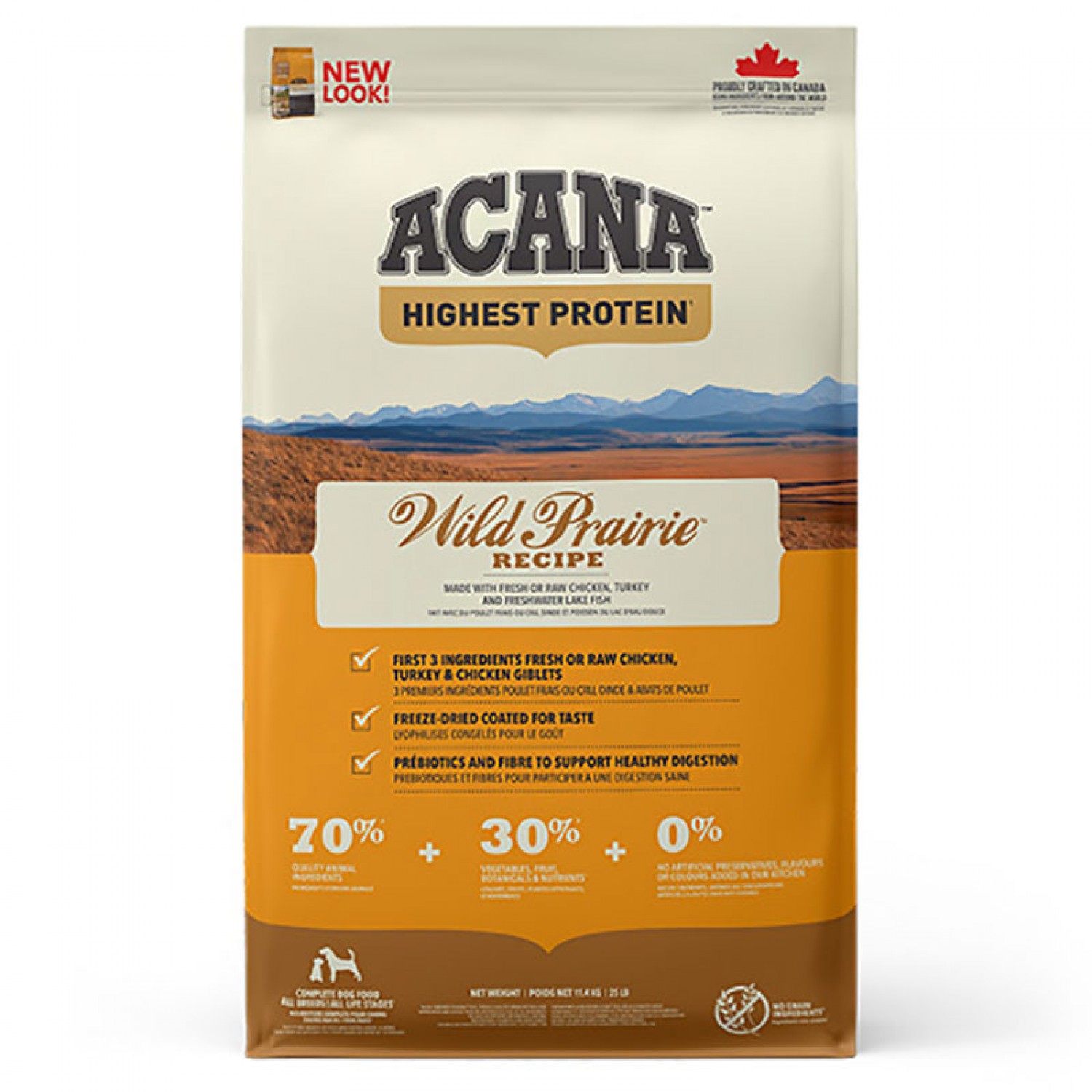 Раціон АКАНА Вайлд Прейріе Ресіпе - багатий якісними м'ясними інгредієнтами (70%), такими як м'ясо курчат та індички, риба виловлена в дикій природі та вирощена на фермах з дотриманням екологічних умов. та на 30% збалансований фруктами, овочами, та травами. Всі ці інгредієнти доставляються до нас на кухні щоденно.