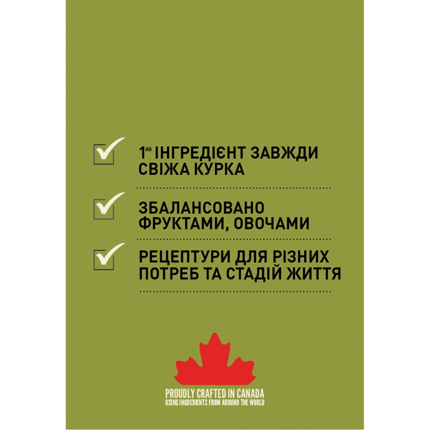 - Багаті білками і жирами інгредієнти корму (місцеві канадські курчата, вирощені на вільному вигулі, цільні яйця і тихоокеанська камбала) доставляються свіжими і не містять консервантів.