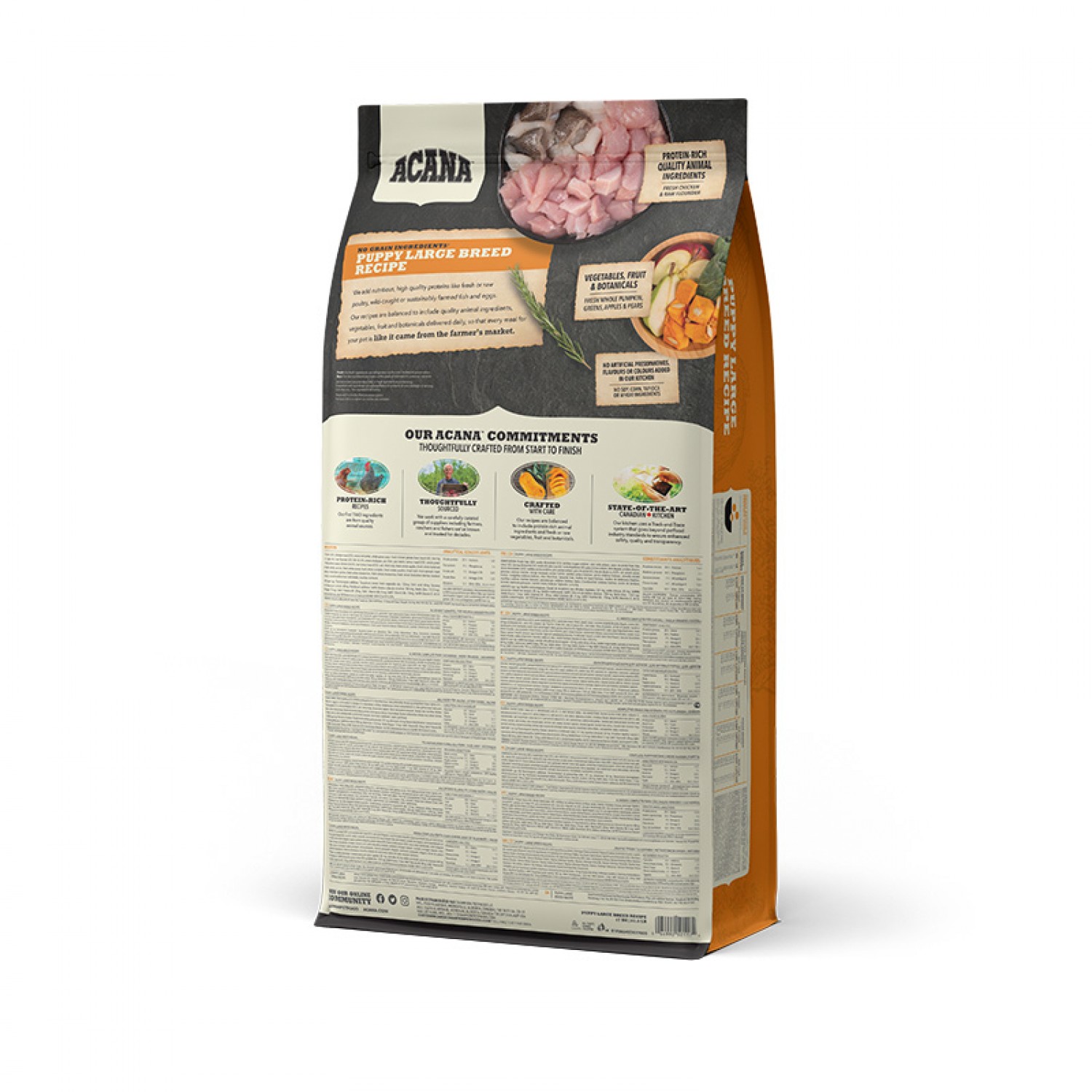 Коли це стосується корму ACANA, кожен інгредієнт має значення. Саме тому, рецептура Puppy Large Breed Recipe створюється з турботою та думкою про зростаючих цуценят всіх порід. Рецептура Акана Паппі Лардж Брід Ресіпе на 70% переповнена якісними м’ясними інгредієнтами, такими як м’ясо канадських курчат та сирої камбали та на 30% збалансована фруктами, овочами та травами.