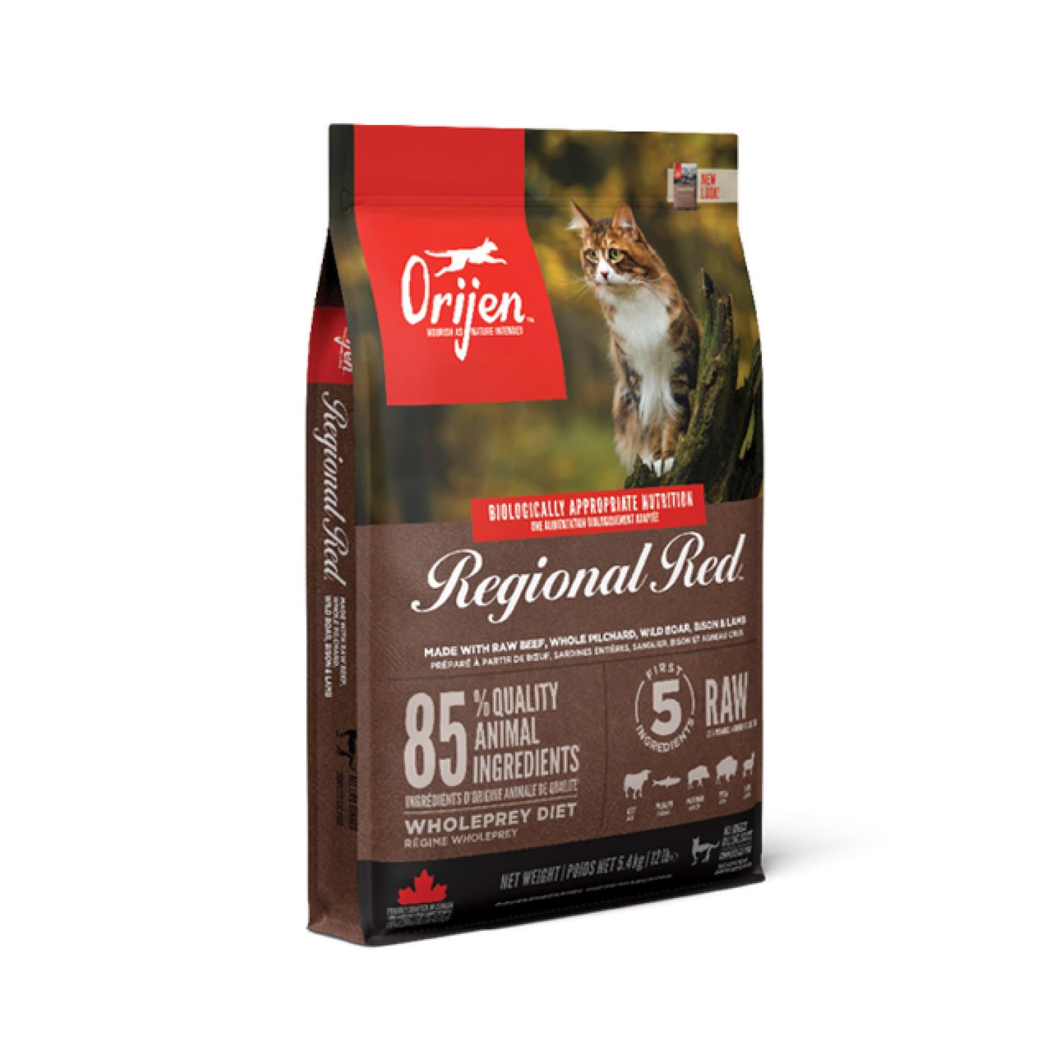 Допоможіть вашій кішці бути щасливою та процвітати за допомогою сили високо протеїнової рецептури, що забезпечує харчування найвищого рівня. Коти від природи м’ясоїдні, тому вони потребують Біологічно Відповідних раціонів, багатих на різноманітні види цільних м’ясних інгредієнтів. Раціон ORIJEN Regional Red Cat забезпечує вашого кота високопоживним протеїнами та нутрієнтами, яких вони потребують, зі свіжих або сирих інгредієнтів, таких як м’ясо бичків, дикого кабана, бізона, ягняти та поросят.