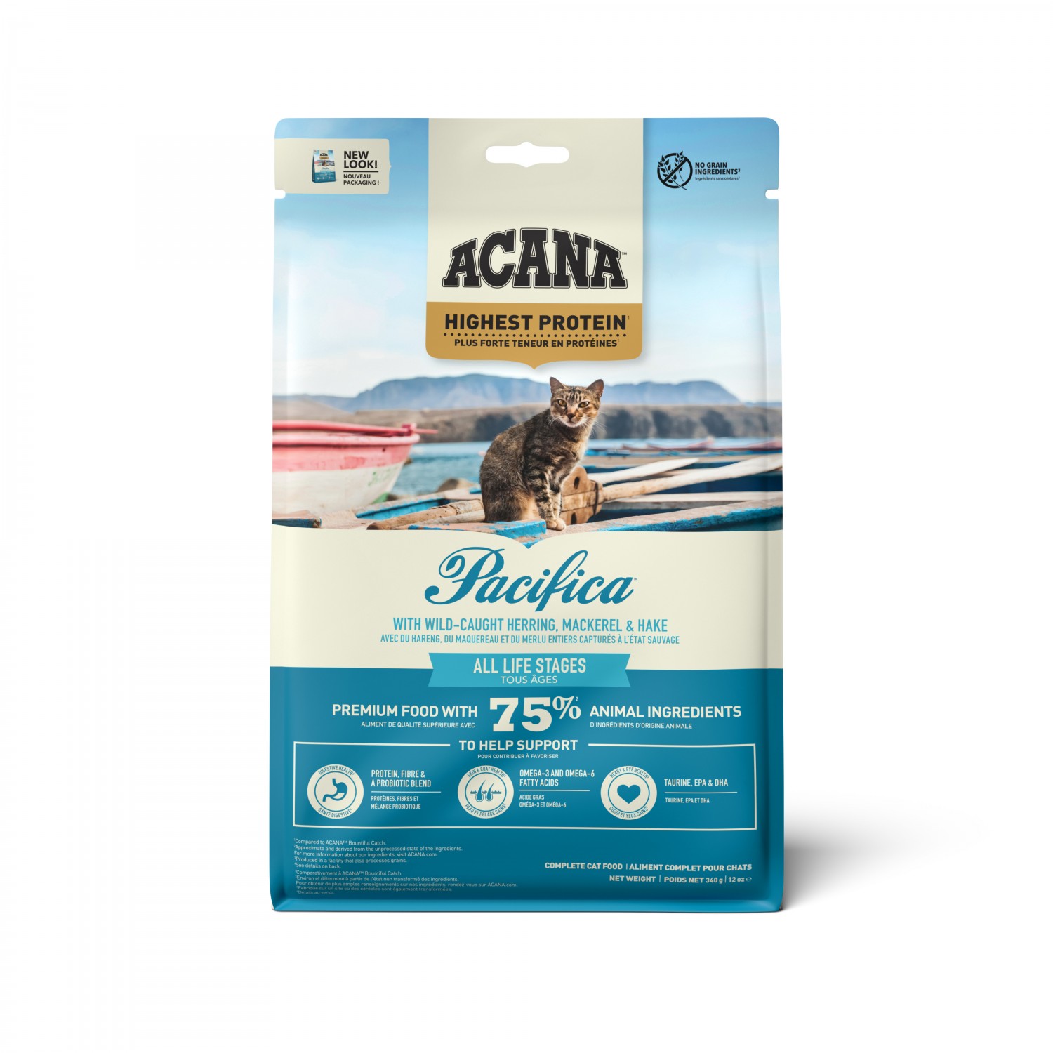 Коти анатомічно пристосовані до раціонів з високим вмістом м'ясних протеїнів. Рецептура сповнена різноманітними видами риби, включаючи оселедця, макрель, камбалу, хек та морського окуня, виловлених в Тихому океані. Інгредієнти представлені у співвідношенні WholePrey, включаючи філе риби, органи та кістки. Раціон ACANA Pacifica природно забезпечує вашого кота нутрієнтами, необхідними для відмінного самопочуття, харчуючи вашого кота, так, як задумано природою.
