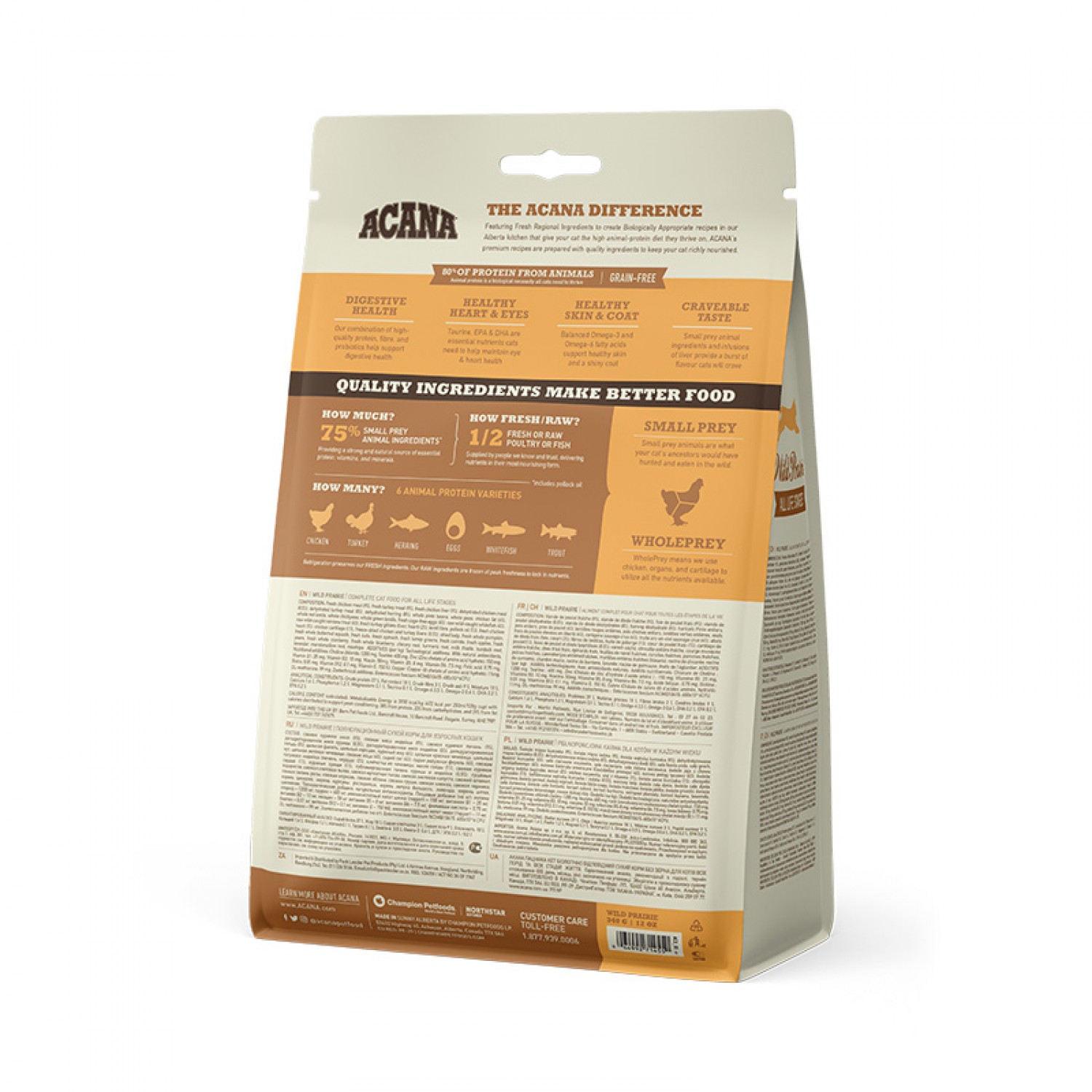 Котам необхідні раціони з багатим вмістом м'ясних протеїнів. Надихаючись нашими великими преріями і кришталевими озерами, рецептура ACANA Wild Prairie переповнена м'ясними інгредієнтами високої якості: м'ясом курчат і індички, вирощених на вільному вигулі, гніздовими яйцями і прісноводною рибою, виловленою в дикій природі.