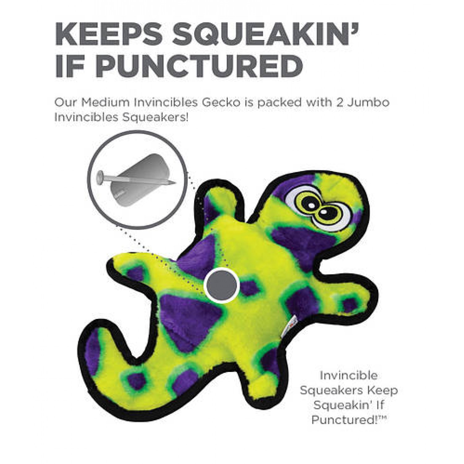 - Пищалка, яка не припиняє пищати: всередину цих іграшок ми вклали нашу непереможну пищалку, тому Гекон пищатиме навіть якщо його прокусити.