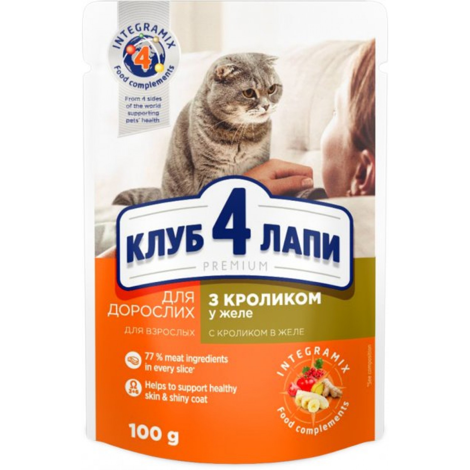 • Омега 3 і Омега 6, що містяться в паучах із кроликом у желе Клуб 4 Лапи для котів, сприяють зволоженню шкіри та м'якості шерсті.